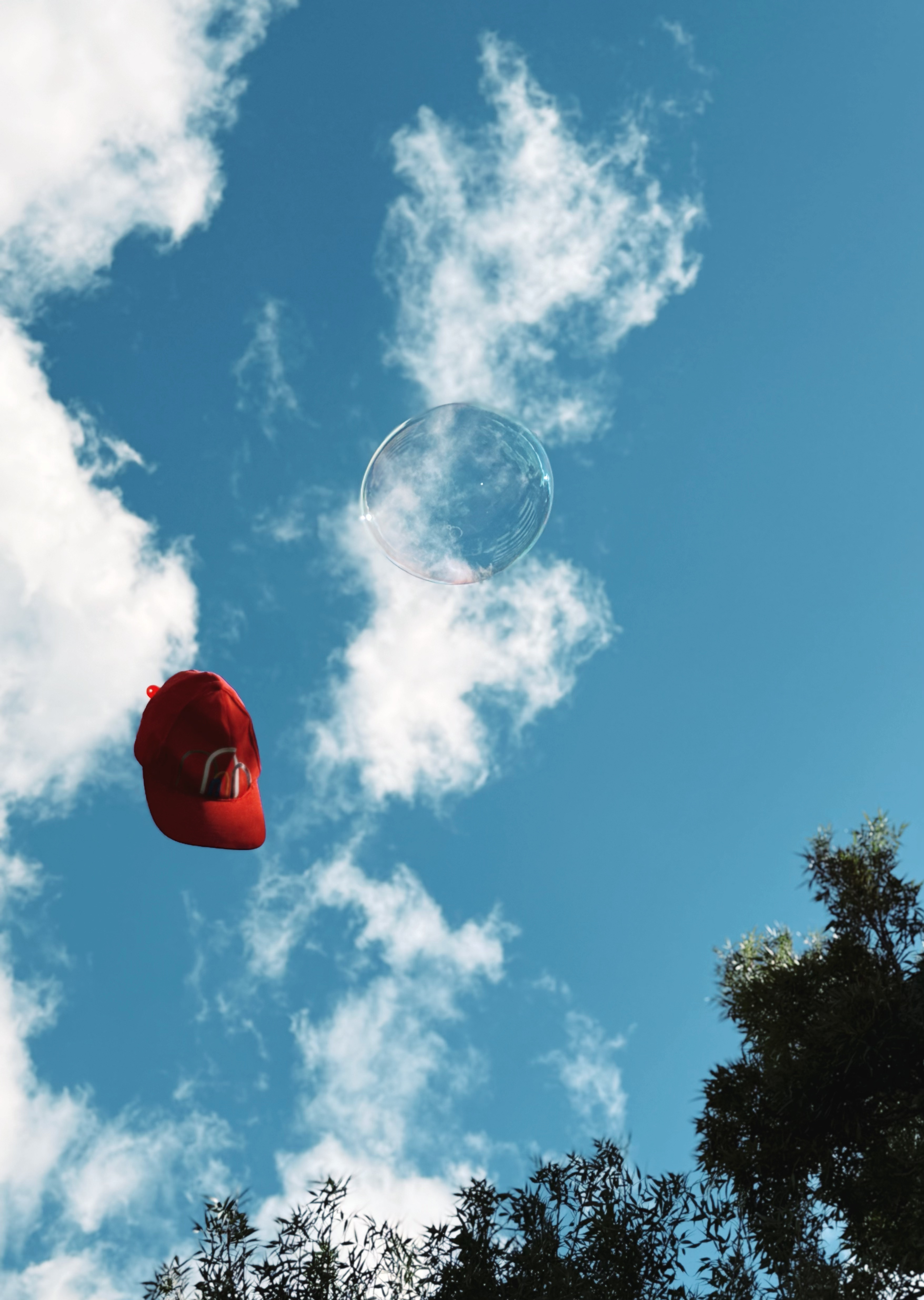 Artistic Critique and Work Description In this fine art photography piece, a vibrant red baseball cap and a transparent soap bubble float together in the vast blue sky, set against a backdrop of scattered white clouds and treetops. This composition constructs a paradoxical sense of poetry—both weightless and free, yet fragile and uncertain. The state of suspension in the image serves as a metaphor for the adolescent experience, symbolizing the fluidity of identity, the yearning to break free from constraints, and the anxiety of uncertainty during the process of growing up. Visual and Symbolic Analysis The red cap is a powerful visual symbol. It can represent individuality and youthful energy, yet it may also signify social identity—whether in conformity or rebellion. During adolescence, individuals often use external objects (such as clothing) to express themselves, but these expressions are fleeting and constantly shifting—much like the cap suspended in the air, detached from its owner and seemingly about to be carried away by the wind. The soap bubble, on the other hand, carries another potent symbolism. Its transparency and ephemeral nature evoke the vulnerability of adolescence. Emotions, dreams, and relationships during this phase often resemble a soap bubble—beautiful yet fragile, appearing whole on the surface but bursting at the slightest touch. The interplay between the bubble and the cap reinforces the theme of instability; both exist in a precarious state, on the verge of vanishing. This uncertainty is one of the most defining psychological characteristics of adolescence.