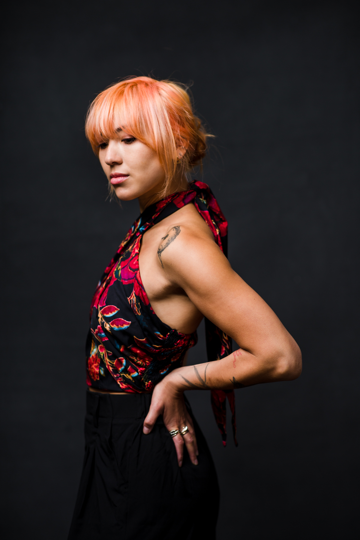 The portrait is created as a self expression. The choice of background and lighting lay out a somber and dark mood, echoing with the dark trousers. Yet the vivid hair color, bright prints from her top and the expressive tattoos on her skin deliver boldness and contrast. Together with the confident posture, the portrait conveys a bold narrative of resilience and identity, vulnerability and strength.