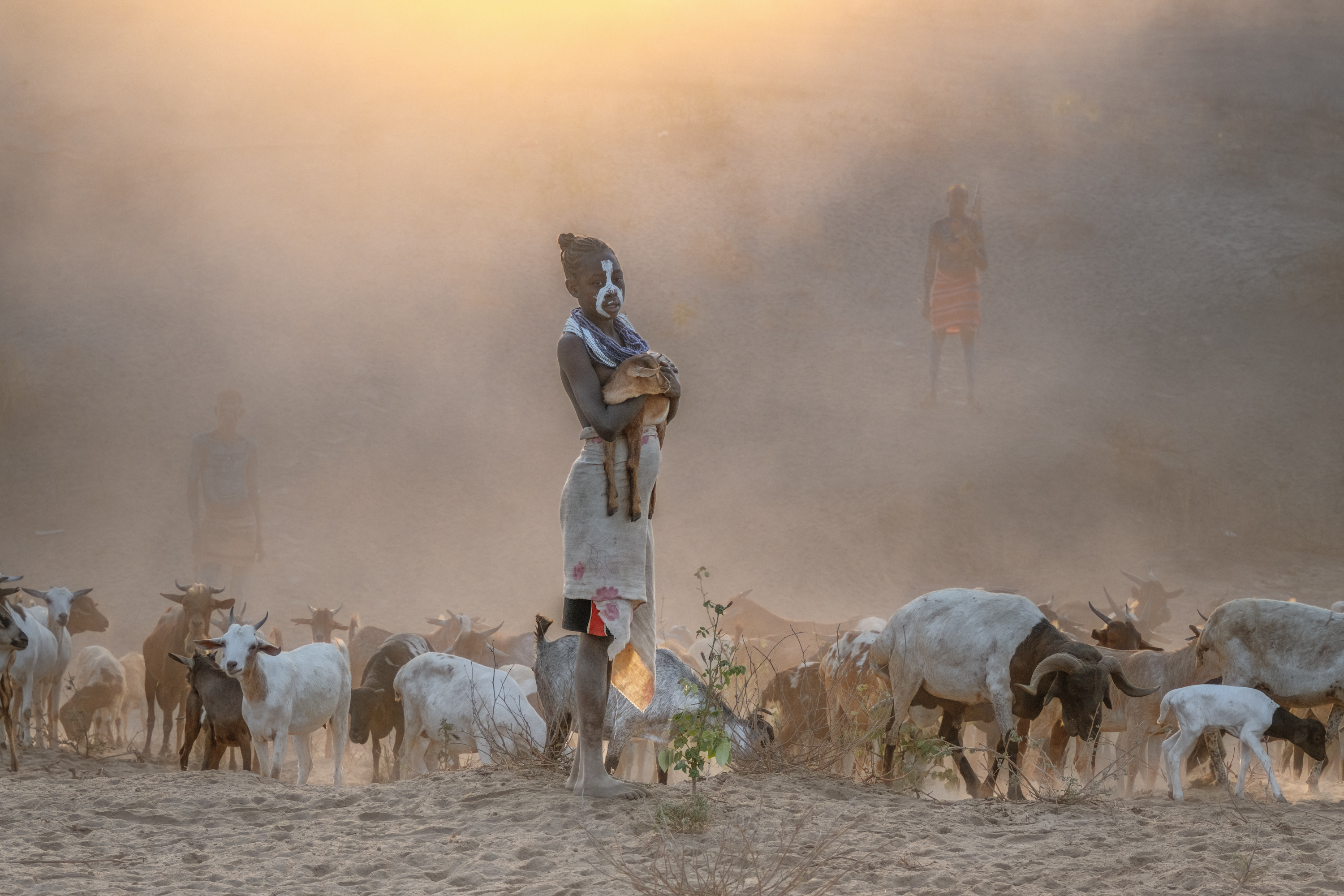 The people of the Ilemi triangle are comprised of a number of tribal groups who live in harmony with their environments in the Omo valley of Ethiopia, Central and Eastern Equatorial in South Sudan, Northern Kenya and Uganda. Whilst these tribes live remotely and are resilient to change, change is nonetheless a reality of living on the edge of existence. These people transcend a world where practices have changed little in centuries and a world which continues to transgress into their lands and which has potentially huge impacts and is out of their control. Climate change, expanding road and communication networks, tourism and government influence, including the development of large dams impacting on river flood regimes. Additionally there is the impact of ‘westernisation’, the spread of the ubiquitous Chinese made football shirts, agribusiness and the spread of religion from missionaries. Despite this collision of cultures the tribal groups are resistant but changes to nomadic ways of life or transhumance are inevitable. These images reflect their dependence on pastoralism and their traditions but in the last two decades there have been more droughts and shorter recurrence intervals between flood events. Taking these photographs has, I believe, become an imperative as the rate of change accelerates. We no longer see what we saw yesterday and we may not see tomorrow what we see today. Our world is so diverse. Faces are a reflection of cultures which have evolved to adapt to particular biomes. These people are being acculturated as pressure on habitats and remote spaces increases. The photographer, in capturing these cultures, is documenting what may be a part of history in the near future. The photographs here are from two ethnic groups, the Mundari cattle herders of South Sudan and the Kara of the Omo valley. The photos, whilst atmospheric, indicate the increasing lack of water security as river regimes change and longer droughts become commonplace. These people have a small ecological footprint and the industrial west is a major catalyst of unwelcome change.
