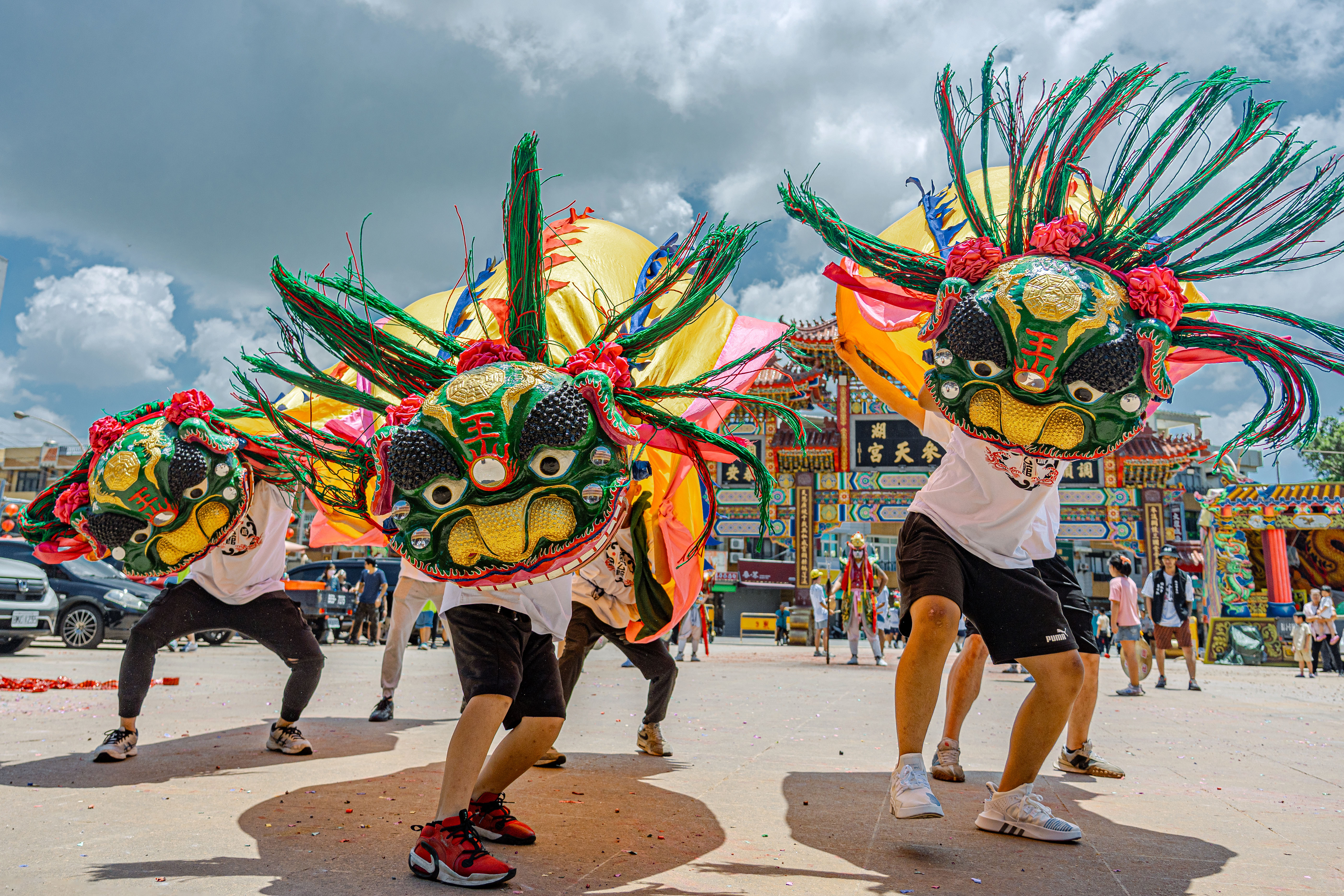 Lion dancing is a performance with distinctive Chinese cultural characteristics and a long history. It is usually performed by one person controlling the lion's head and another controlling the lion's tail. It is commonly seen at temple fairs, but it is rare to see three groups of lion dancers performing at the same time, which is even more spectacular than usual.
