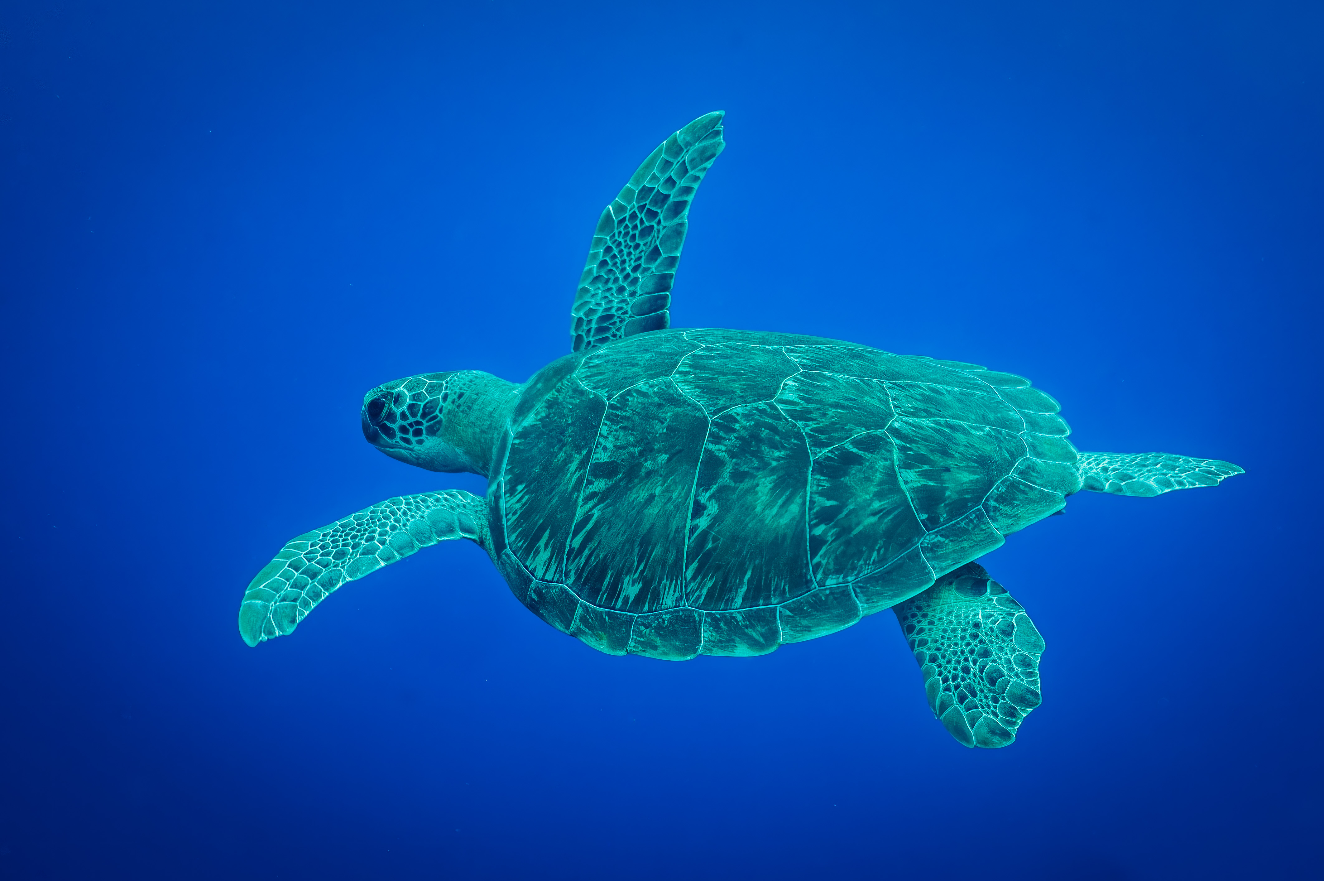 This a very simple image; just a turtle and blue ocean water. I was about 60 feet down when I spotted this young green turtle from maybe 100 feet away at the surface. I tried to move to where I thought the turtle might descend, and it spectacularly rewarded my guess. It was swimming freely and turned slightly on its side against the blue ocean water to display its fabulous shell. Post-processing in Lightroom, Photoshop, On1, and Luminar.