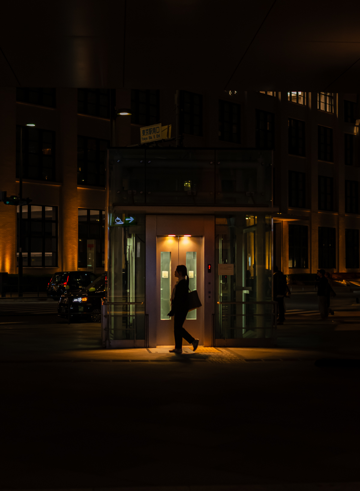 Just outside Tokyo Station, a narrow beam of light sliced through the darkness. Its geometry belonged to the architecture. Its timing belonged to the city. A woman passed through it at the perfect moment, and I captured that quiet collision of space, light, and life.