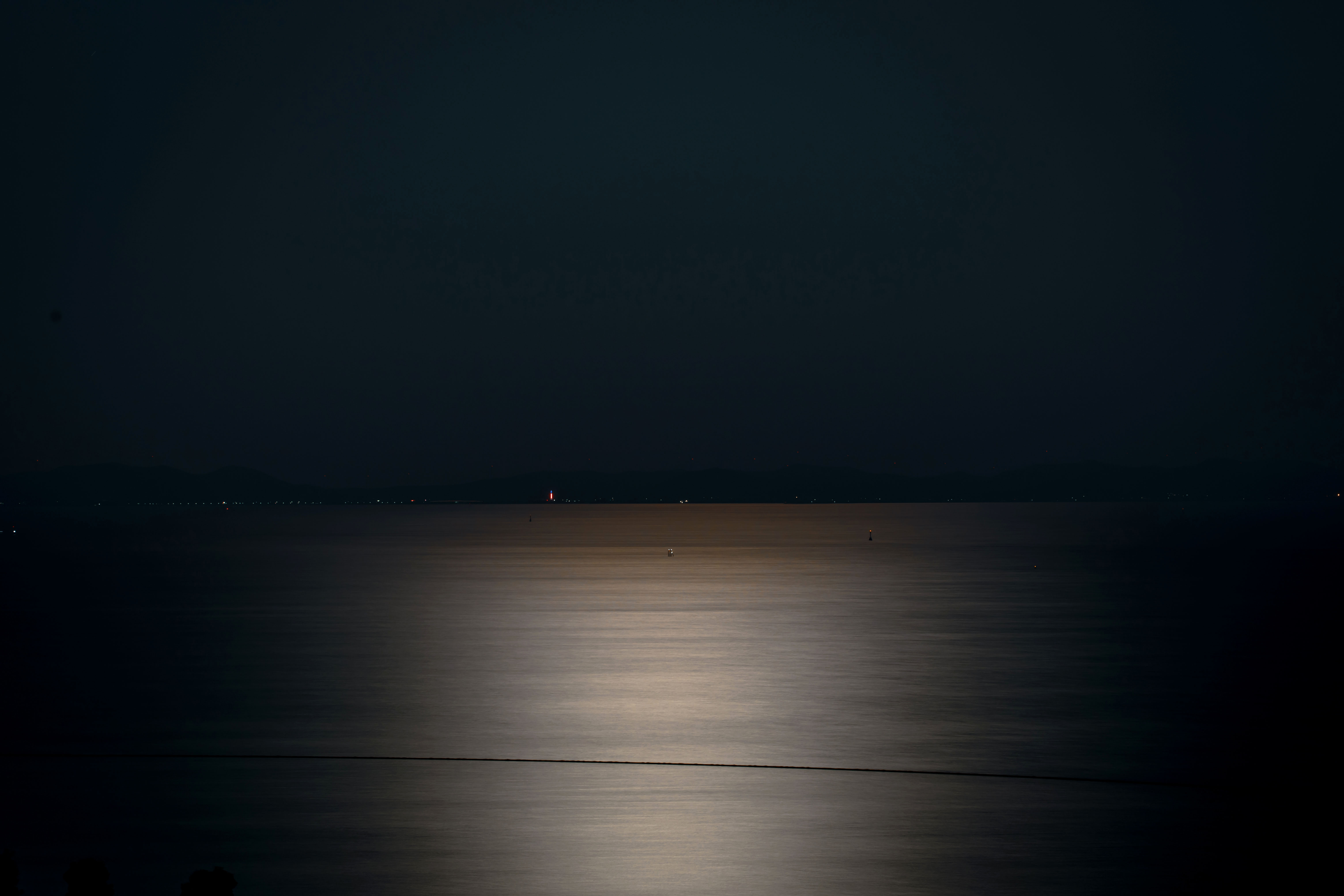The photograph captures the surface of a lake at night, where darkness overtakes both sky and water. The boundary between reality and imagination dissolves.