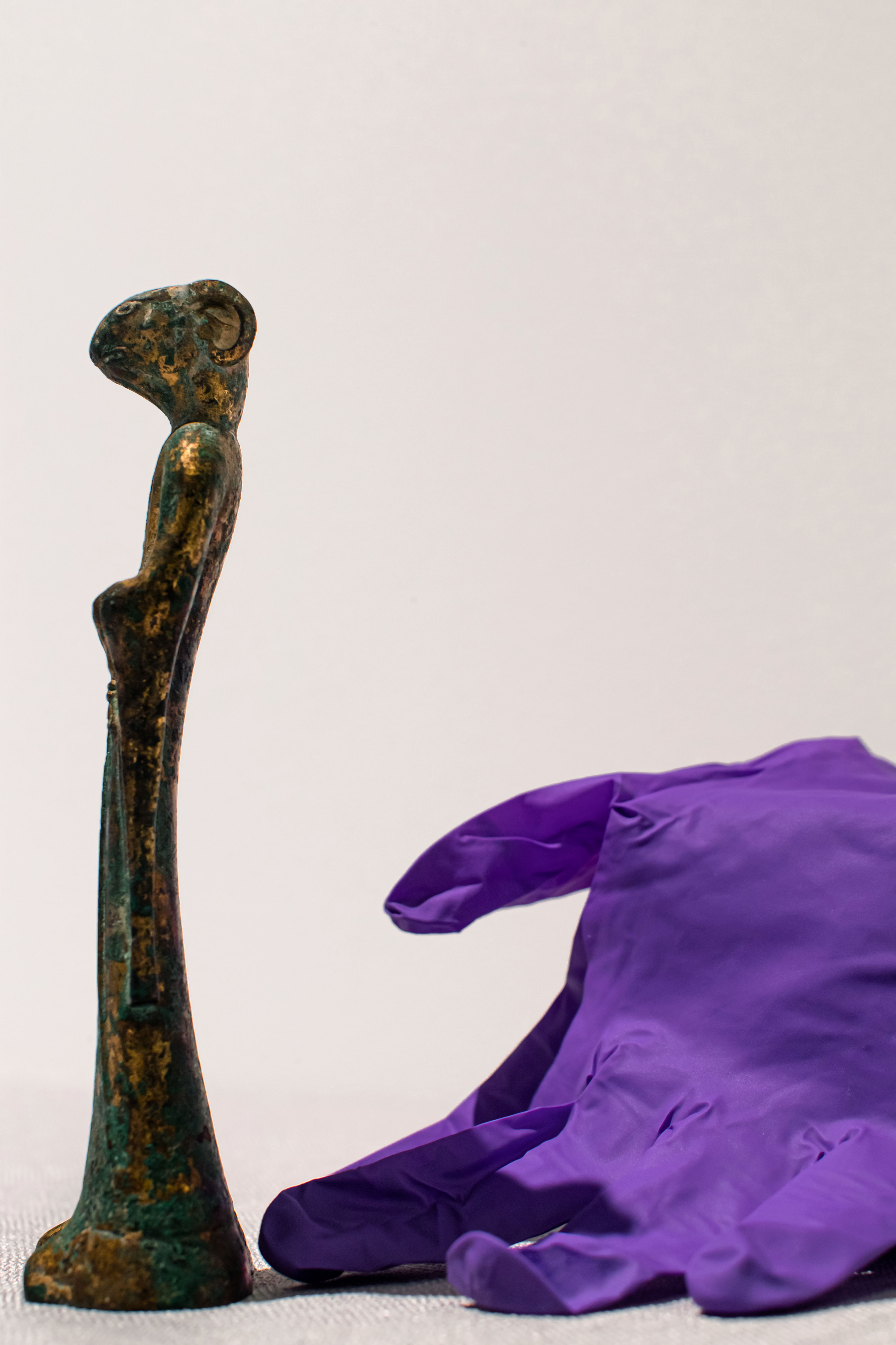 The contrast is immediate. The precise contour of the statue stands against the glove’s formless collapse. Yet the glove is not merely practical, it is a trace of an unseen ritual, the invisible hand that prepares art for its passage into a new collection.