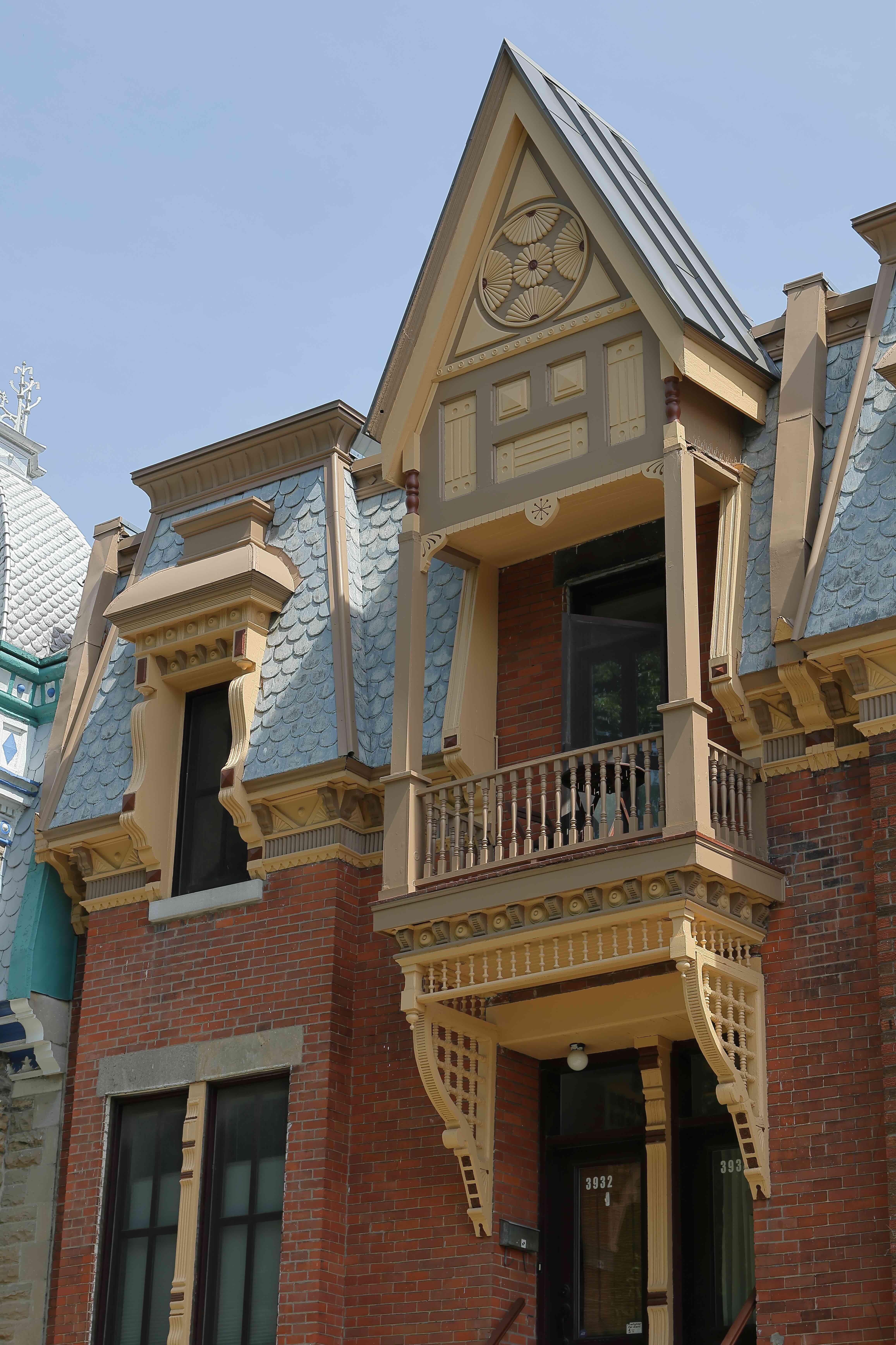 This photograph presents a late-19th-century house in Saint-Henri, Montréal, where brick, slate, and wood converge in a symphony of detail. The mansard roof, clad in fish-scale shingles, anchors the composition, while the wooden balcony and gabled pediment bear witness to the care of artisans who believed that ornament could elevate even modest dwellings. Saint-Henri was once a hub of industrial activity, its streets lined with workers’ houses built between 1880 and 1910. These homes were not grand estates, but they carried the dignity of craftsmanship: carved brackets, painted balusters, and geometric motifs that brought rhythm and elegance to everyday life. In this image, the geometry of lines and textures — slate against brick, wood against sky — invites contemplation of heritage as a living presence. It is a portrait not of nostalgia but of endurance, a reminder that history is inscribed not only in monuments but also in the façades of ordinary streets. The stillness of the frame becomes a gesture of recognition, preserving a fragment of cultural memory in the face of urban transformation.
