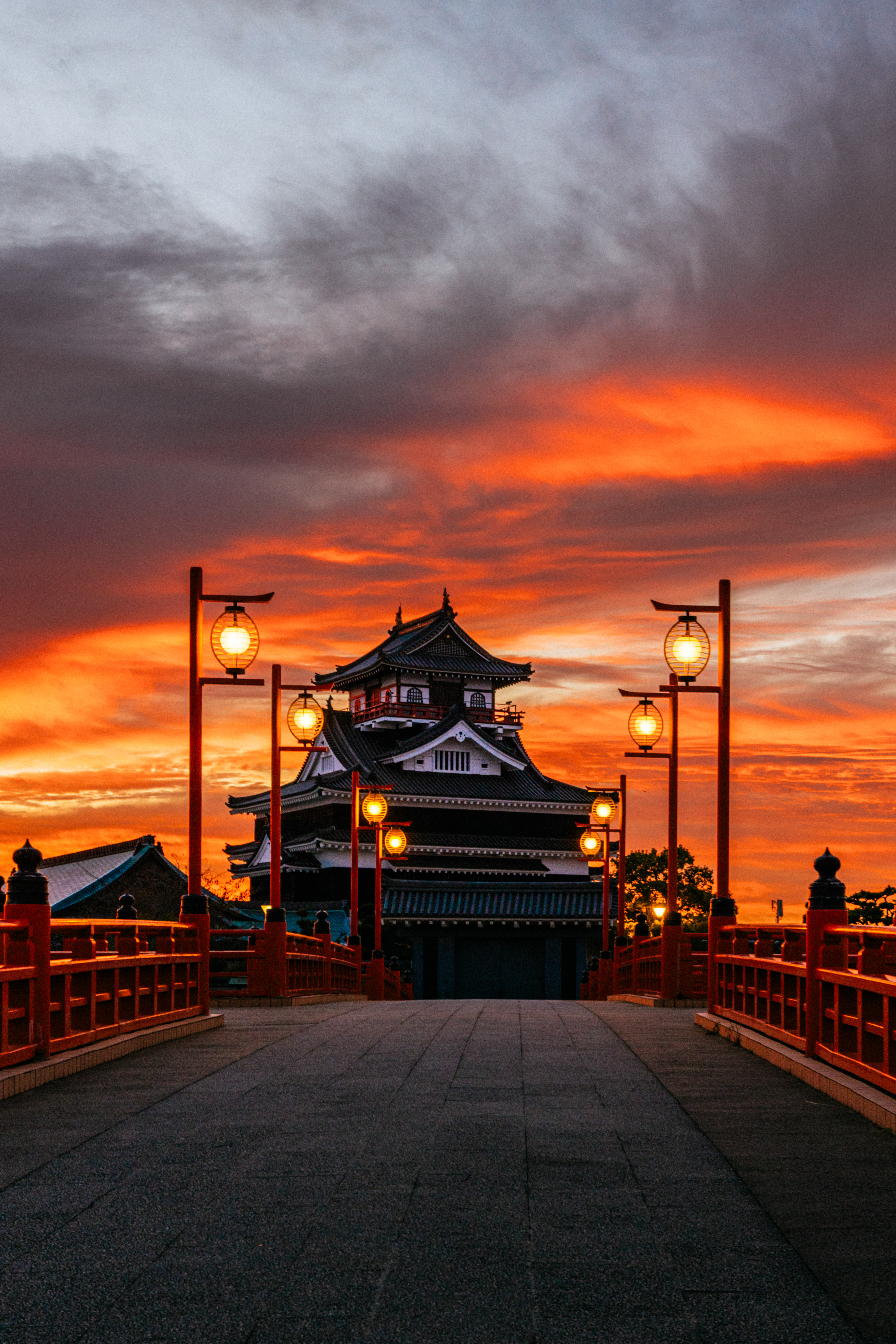 As the sun sets, fiery skies embrace the silhouette of a Japanese castle, where tradition stands timeless beneath the glow of twilight. The scene captures a fleeting harmony between architecture and nature, evoking both power and serenity.