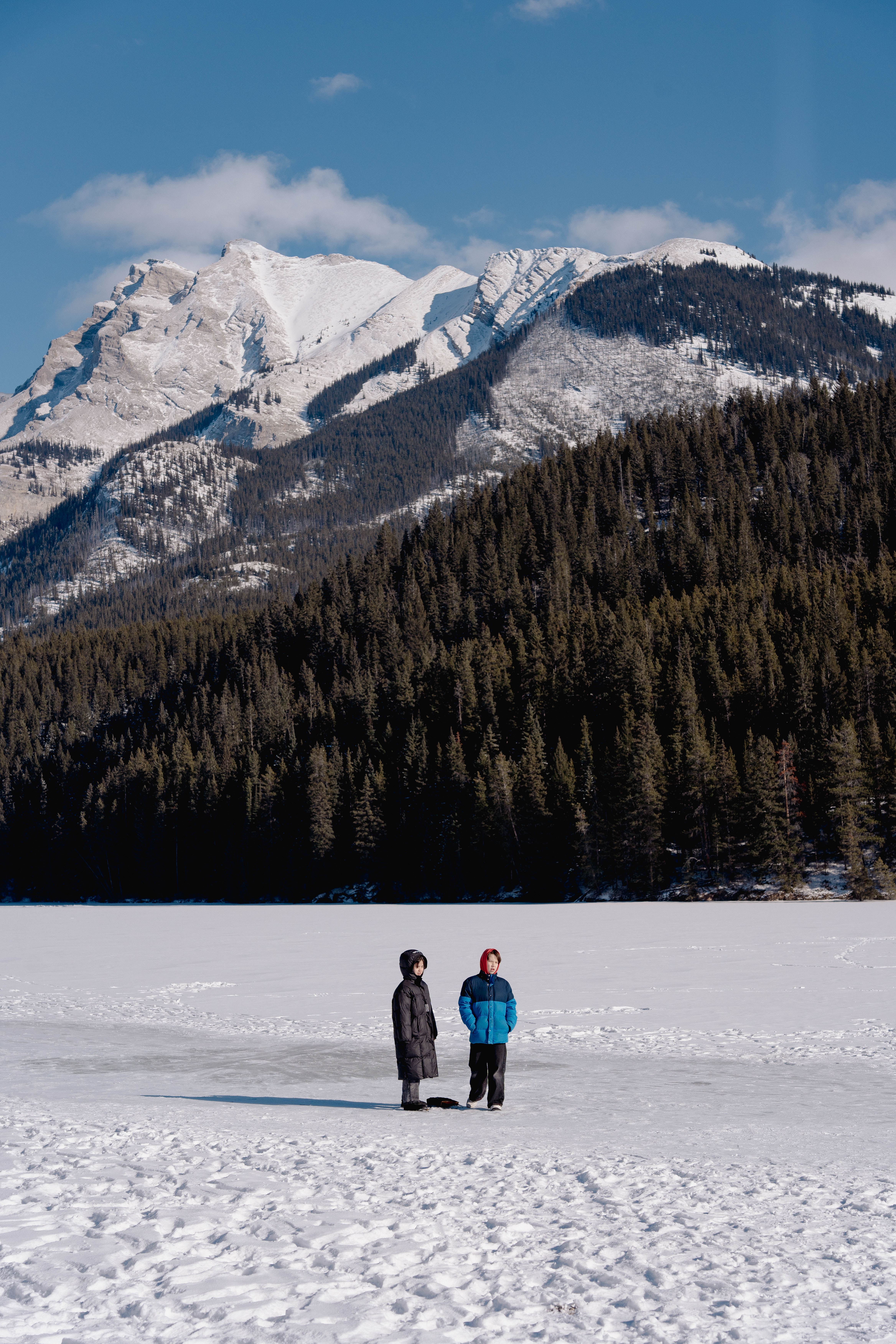 The work depicts two children standing on a frozen lake in Banff. In the composition, the black coat echoes the dark forest, while the blue jacket resonates with the clear sky, and the red hat serves as a striking accent that breaks the monotony of the cold palette. Through this subtle correspondence of colors, the figures establish a visual dialogue with their surroundings, conveying a sense that, although small, they are not isolated but rather an integral part of nature’s harmony.