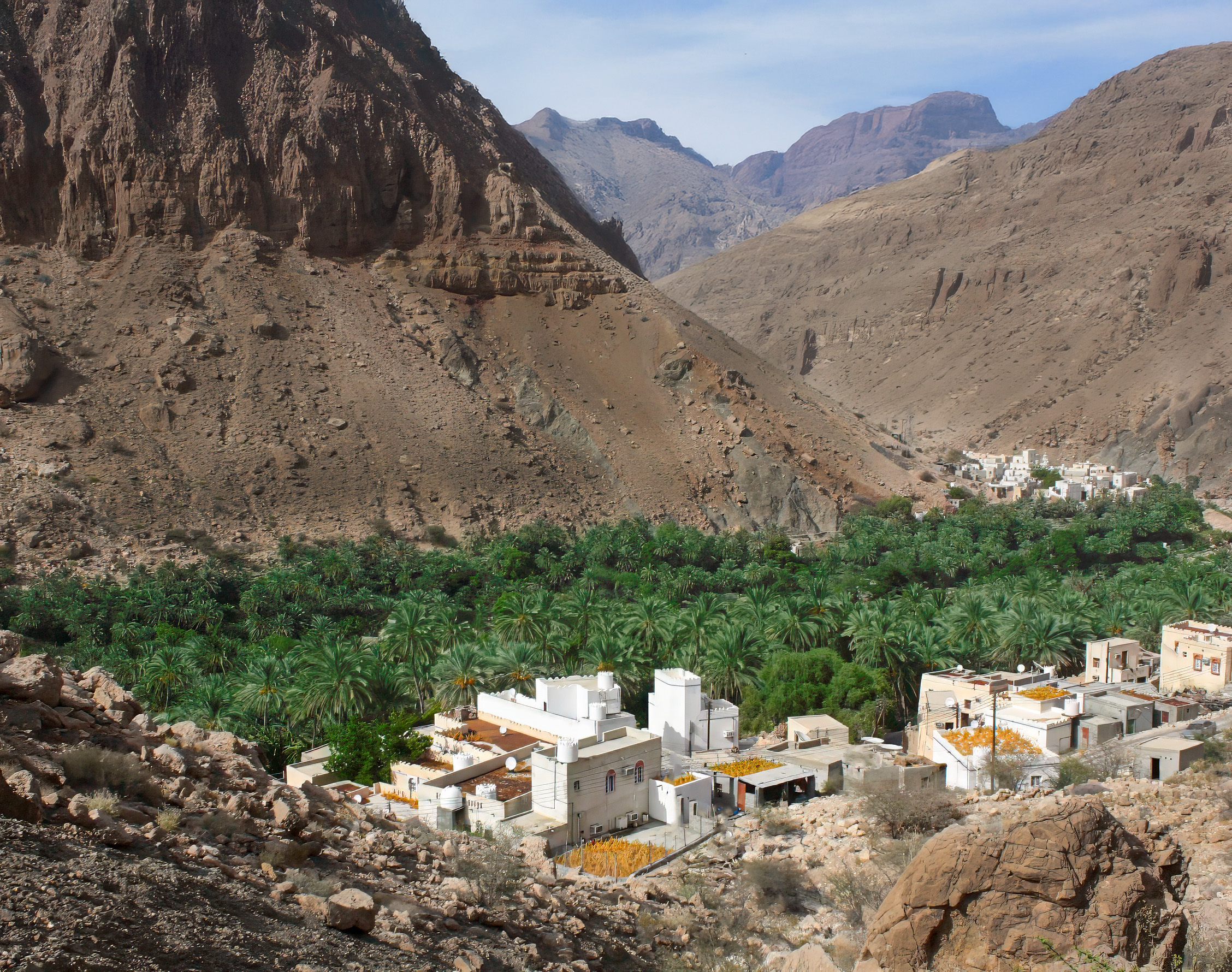 This is a view of a small village in Oman with dates drying on the rooftops.