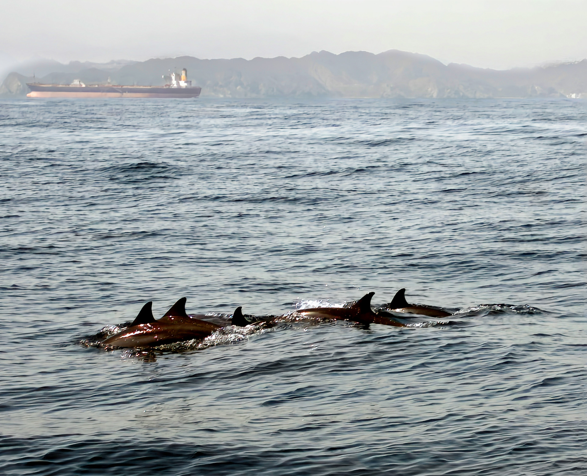 On board a small boat in the ocean, the dolphin came to play. In the background a large oil tanker shows the difference between nature and reality of life.