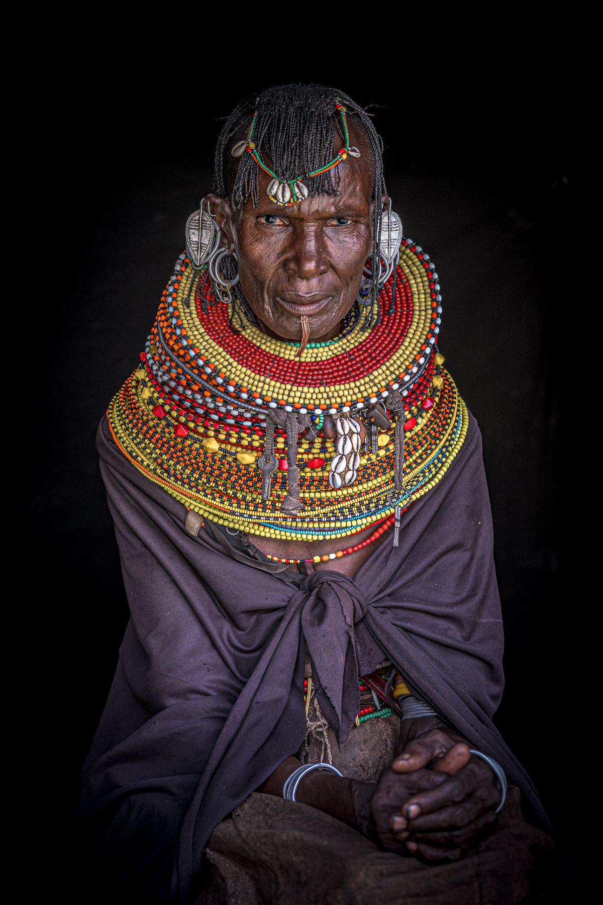 Turkana woman wearing leaf-shaped earrings made from old aluminium cooking pots. The earrings, not only serve an aesthetic function but are a sign of cultural identity, social status within the community and are associated with initiation rites or important ceremonies in a woman's life, such as marriage or the passage into adulthood.