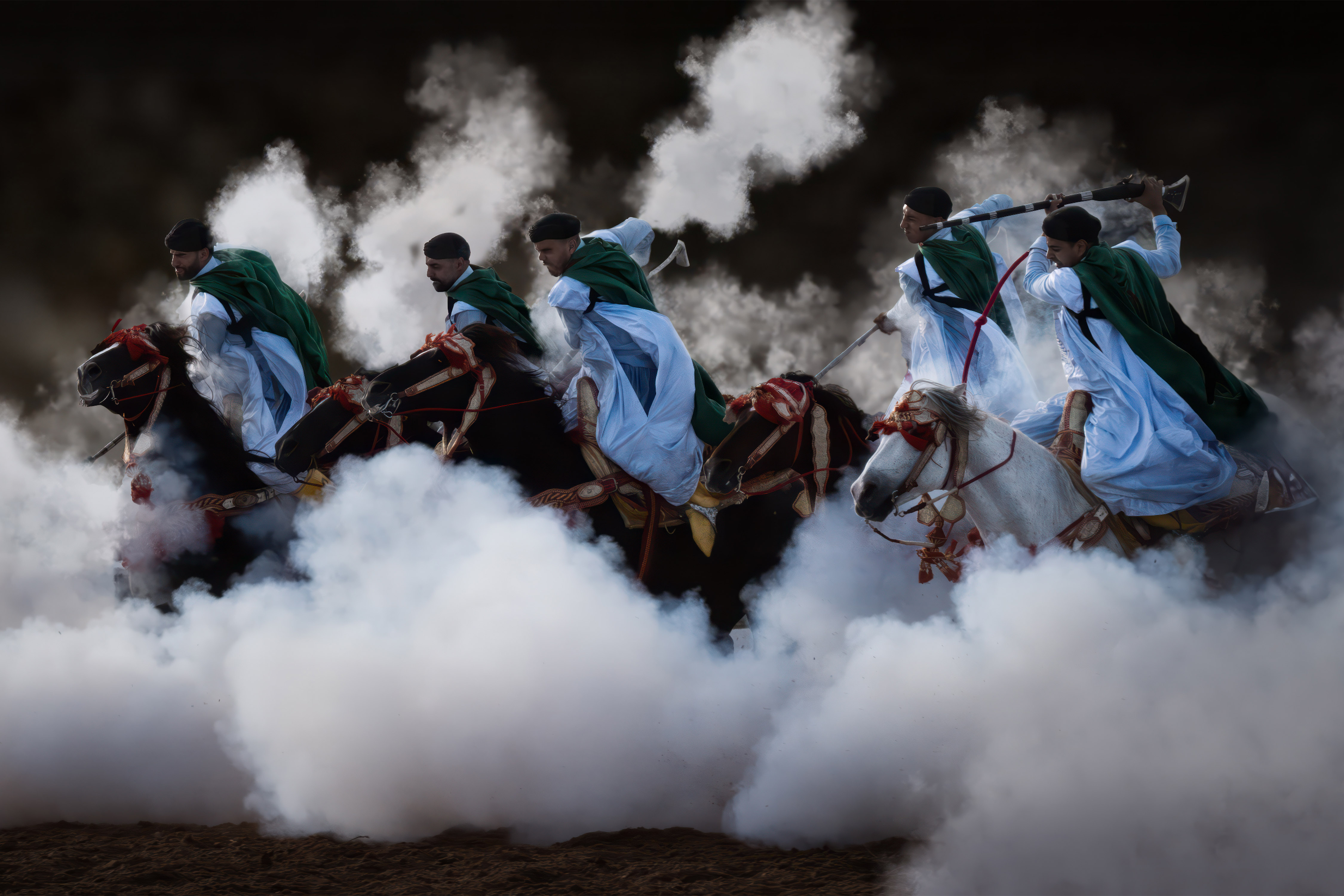 A mesmerizing scene from the 2023 Moroccan Tabourida at the Algadida Equestrian Contest, capturing the essence of a 15th-century military parade. Smoke billows from the ground as rifles fire, evoking the historical tactic where enemies concealed themselves beneath the sand. A breathtaking celebration of tradition and a living UNESCO World Heritage moment.