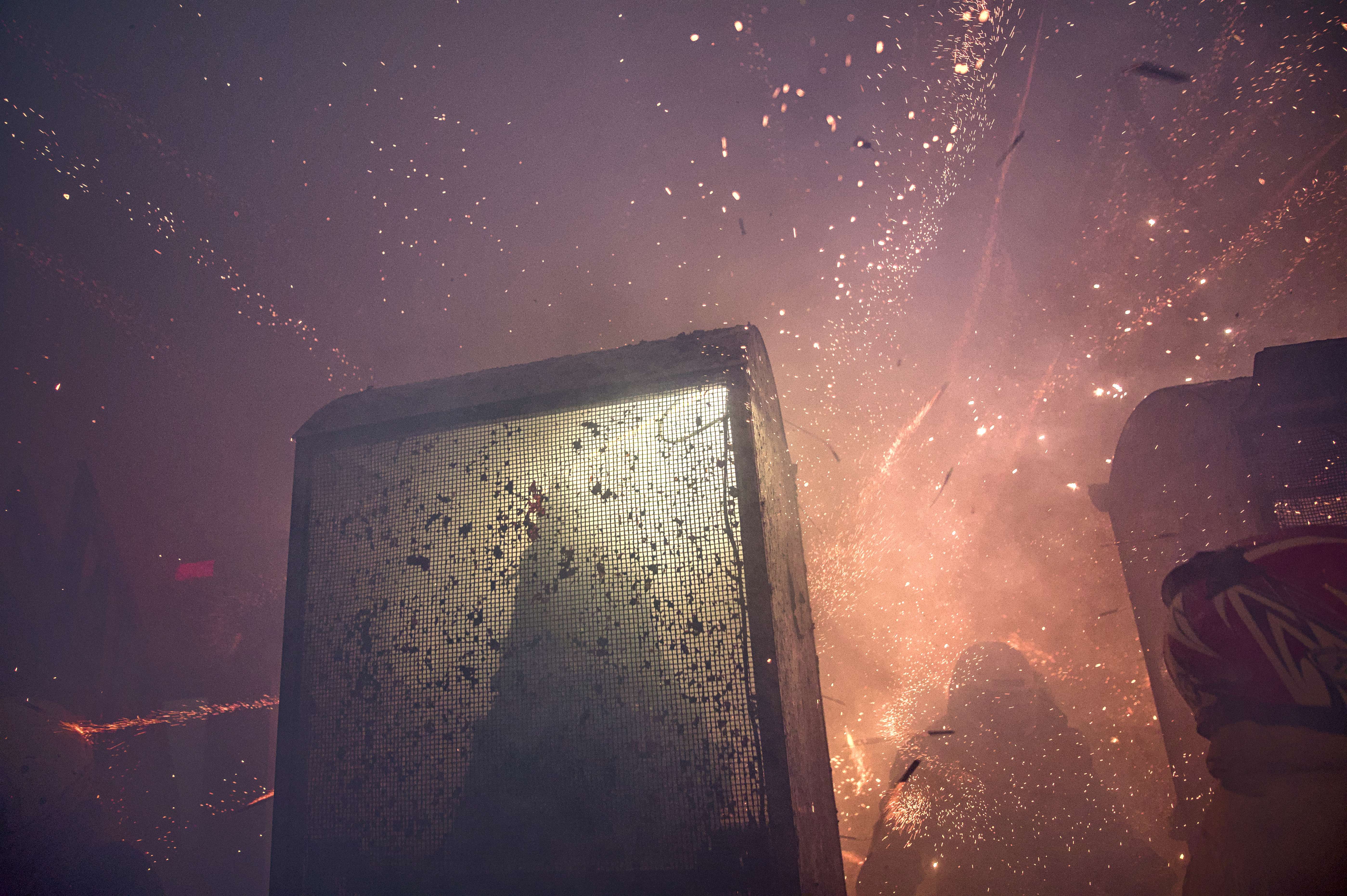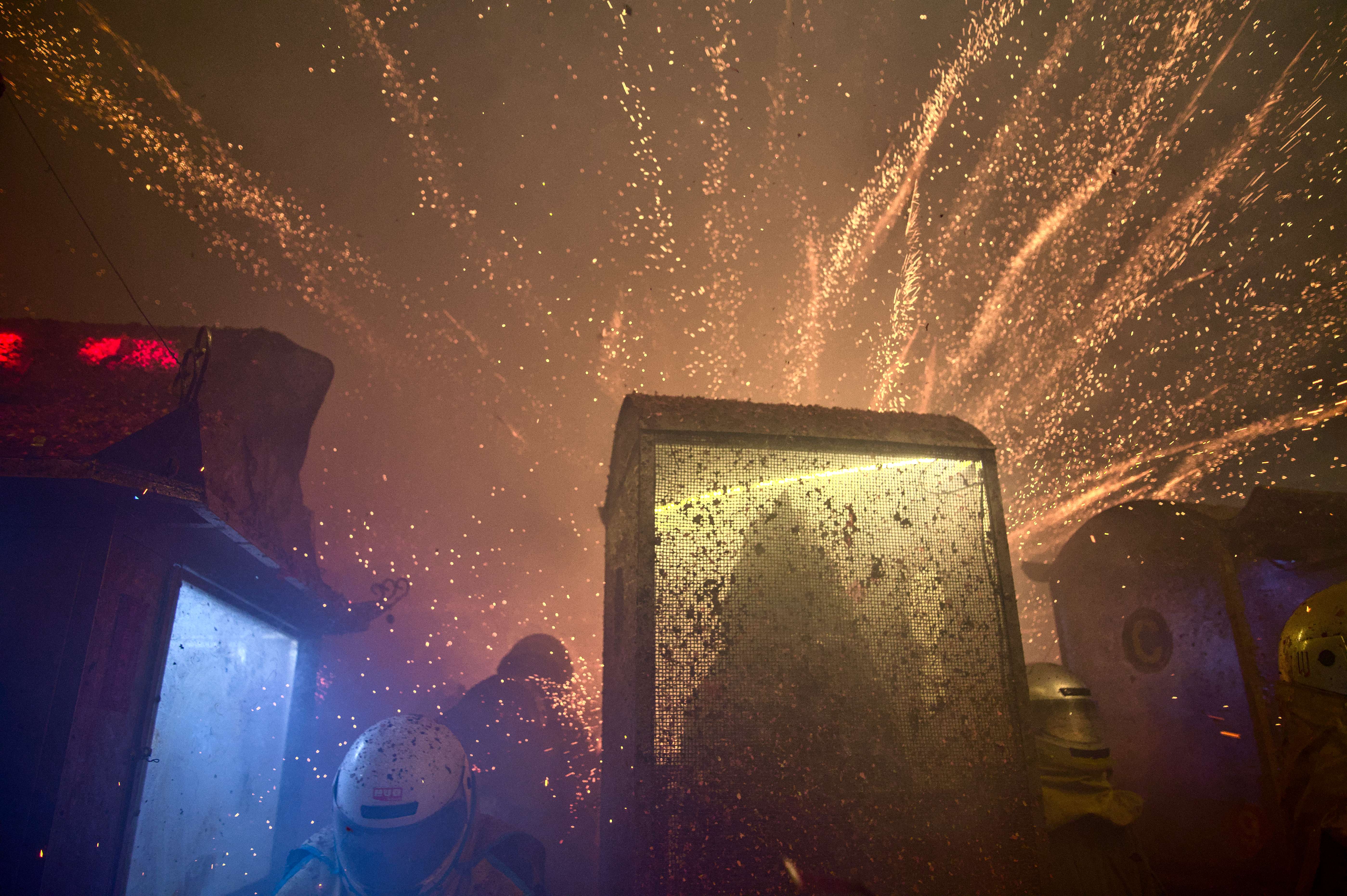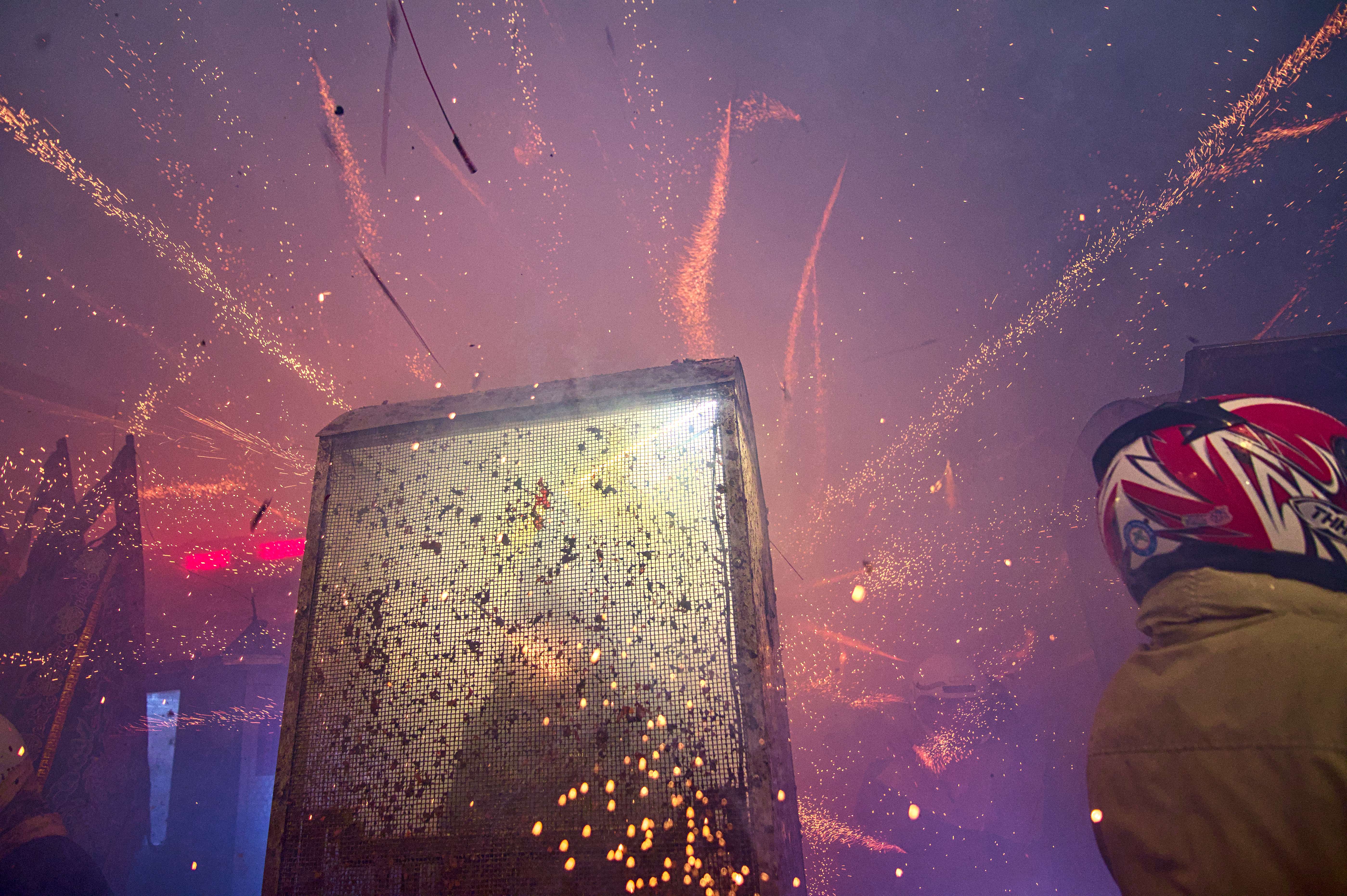 During the Lantern Festival in 2025, People wore hard hats and enjoyed the bombardment of honeycomb fireworks, symbolizing the removal of bad luck.