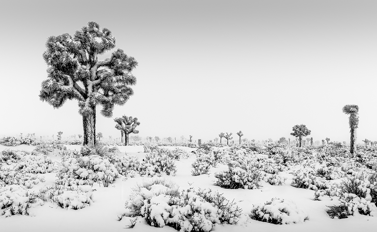 Captured in the springtime within the bounds of Death Valley—one of the hottest places on Earth—Joshua Chill documents a surreal moment where climate defies expectation. A fresh blanket of snow covers the arid desert floor, transforming the iconic Joshua Trees into frozen sentinels standing in quiet defiance of their typical sun-scorched environment. This image speaks to the increasing unpredictability of weather patterns, even in regions long defined by their extremes. The stark black and white treatment emphasizes the contrast between the expected and the actual, stripping the scene to its essence and heightening the drama of the moment. In the foreground, spiny desert plants are softened by powdery snow, while the Joshua Trees appear both otherworldly and fragile—symbols of endurance paused mid-miracle. In Joshua Chill, the photographer invites viewers to reflect on the delicate balance of ecosystems and the strange beauty that can emerge from climate chaos. By freezing a fleeting moment of contradiction, this photograph captures more than a landscape—it captures a question. One that lingers in the silent hush of snow in a desert landscape.