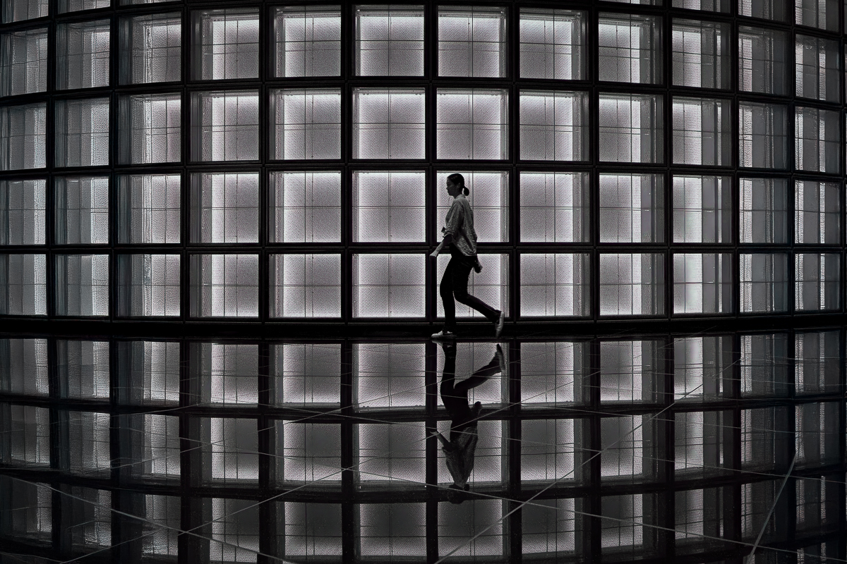 The Shibuya area in Tokyo is a photographer’s dream! These ever-changing black-and-white glass blocks are located in the Shibuya Stream Building. While always black and white, the glass blocks are constantly changing in their uniform patterns and balance of black and white. It’s a semi-circular backlit glass wall in an interior passageway. To create the double reflection, I laid my camera on the shiny black granite floor and waited for an interesting person to walk by Despite our group utilizing no tripods, shortly after I captured this image the security guard ran us out of the building! Post-processing in Lightroom, Photoshop, On1, and Luminar.