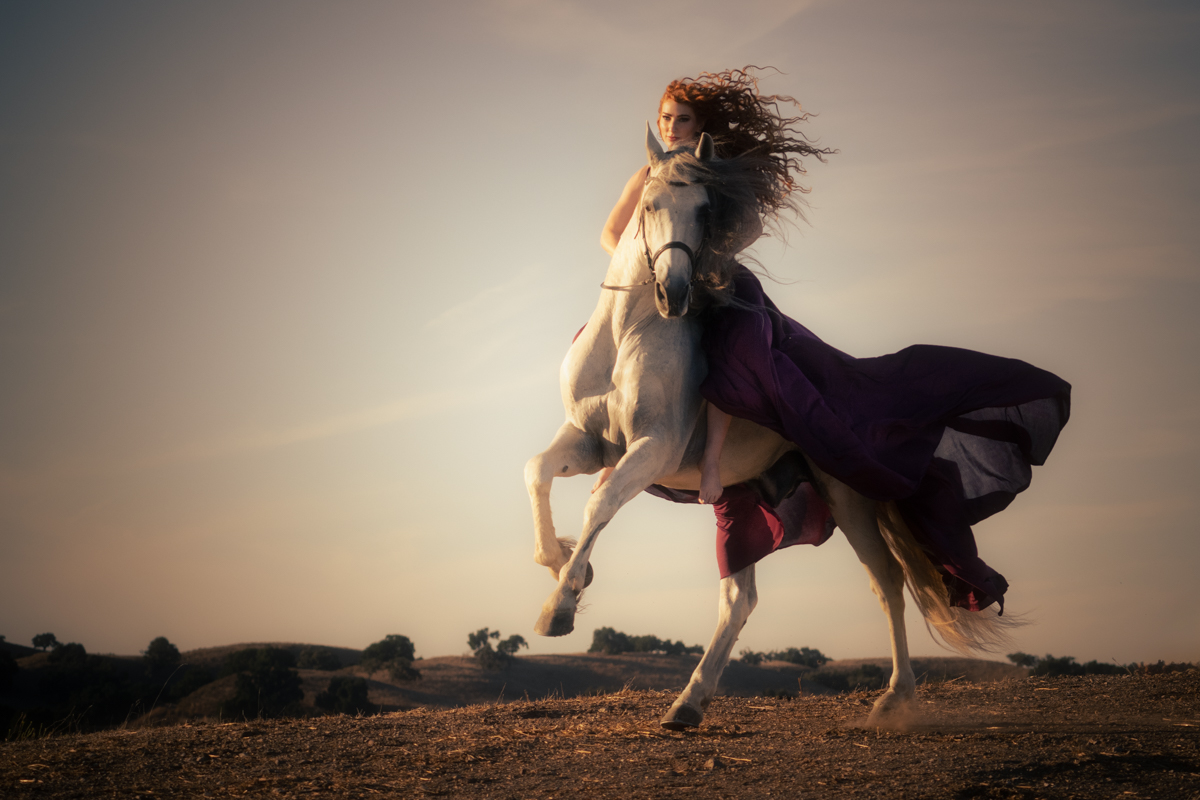 Ethereal Equus is a fine art photography series that captures the unique relationship between horse and rider through motion, light, and form. Shot in natural golden-hour conditions, these images feature a white Warlander stallion and a female rider in flowing garments, set against the open hills of California. Each image highlights the physical power of the horse and the confident presence of the rider, creating a dynamic balance between strength and grace. The light, translucent fabrics of the wardrobe add energy to each composition and enhance the sense of flow. As the horse rears or moves forward in collected motion, the fabric lifts and twists, echoing the lines of muscle and mane. In some frames, the rider’s hair and garments mirror the horse’s movement, reinforcing the connection between them. Lighting and location were also critical to the tone of the work. The warm, directional light of early morning and late afternoon casts soft shadows and brings out detail in both skin and coat, enhancing texture and depth. Post-processing played a key role in refining the final aesthetic. The images were edited to enhance the softness of the light and the painterly quality of the scene without altering the core elements, maintaining a cohesive, dreamlike atmosphere throughout the series. The result is a series that feels both grounded and otherworldly—rooted in real movement, yet touched by a sense of timeless calm.