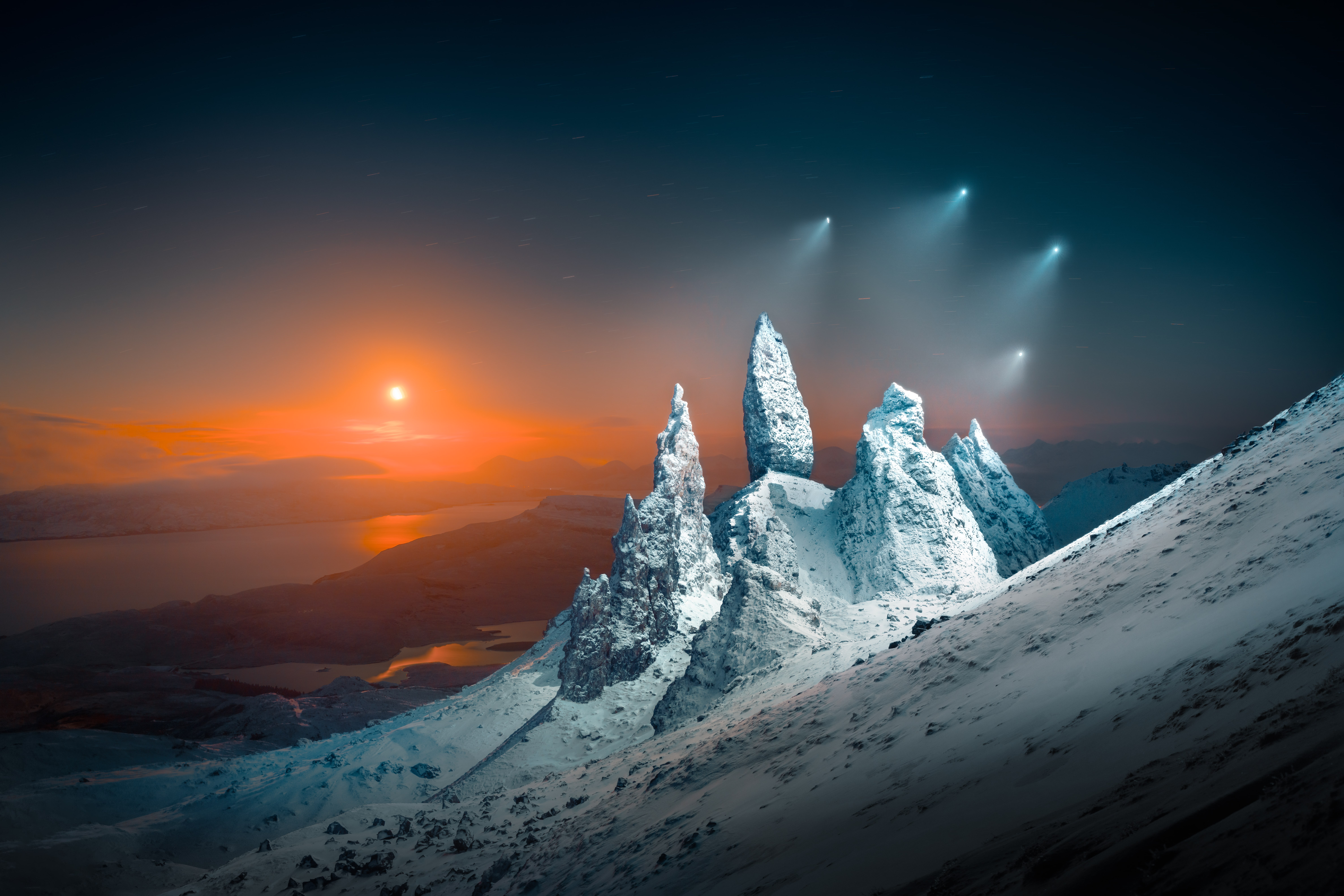 Rock-dominated topographies appear timeless, yet they are relentlessly being reshaped by the forces of geology. These three natural wonders, defined by their towering pinnacles, are visually similar, yet each has its own erosional story. In Scotland, the wintery Old Man of Storr was revealed in a moment of dramatic geological upheaval. An ancient landslide reshaped the landscape in an instant, stripping away softer rock and exposing the towering basalt pinnacles. The Reynisdrangar sea stacks off Iceland’s southern coast were not born from a single event but were severed from the mainland by the ceaseless pounding of ocean waves. In the Italian Alps, the Earth Pyramids of Platten were painstakingly formed one raindrop at a time, their narrow spires standing beneath protective boulders that shield the earth below from being washed away. "The Teeth of Time" is both a geological study and a commentary on the idea of convergence: the recurring tendency in nature for different forces to produce similar forms, echoing patterns across environments and timescales. Photographed at night using bespoke aerial lighting rigs and long exposures, this series isolates and reframes these geological structures. Shaped over millennia by the forces of gravity, water, and wind, they are now sculpted again: this time by light. Under precise artificial illumination, their forms are not altered, but redefined. Contours are revealed, and details made visible that would otherwise remain hidden.