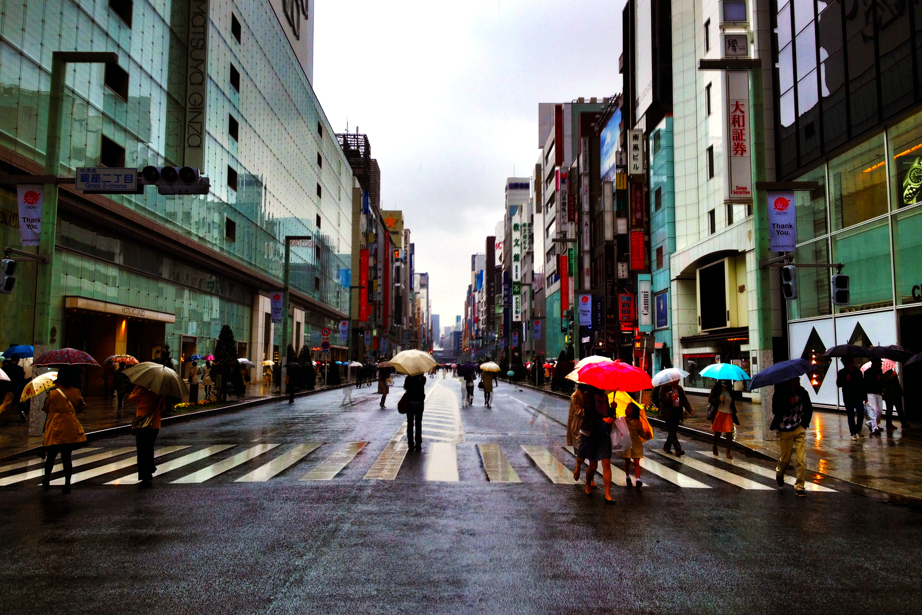 Taken in the rain in Ginza district of Tokyo on a Saturday when the street was closed to cars, I used my iPhone 4s to create an HDR stacked image to create the ghost like images of people walking.
