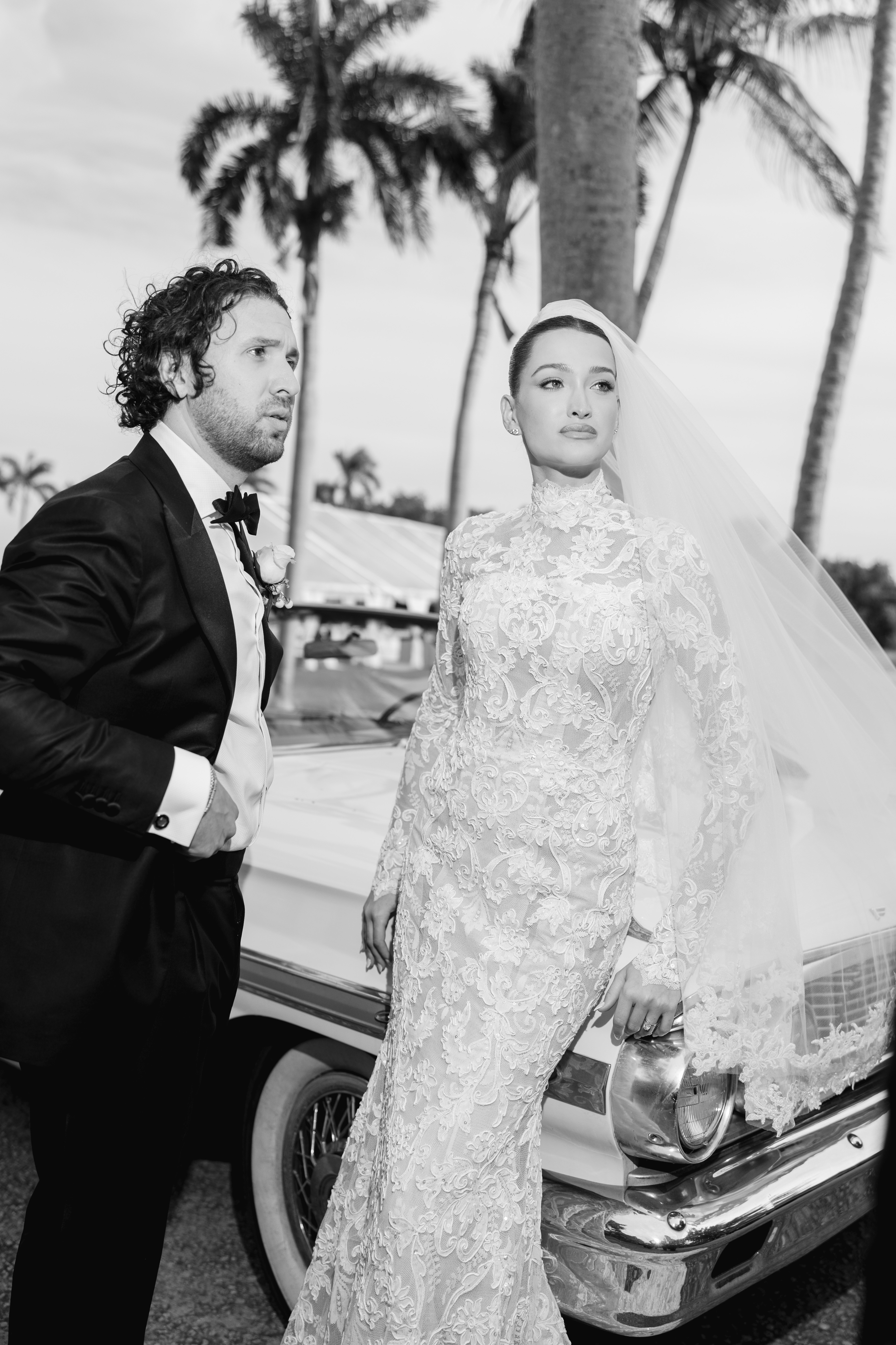 A striking black-and-white portrait of a bride and groom that merges classic beauty with modern editorial edge. Shot in Miami under the tropical sky, this moment combines structured fashion with confident stillness. The bride’s detailed lace dress and powerful posture contrast the soft fabric and romantic narrative of the scene.