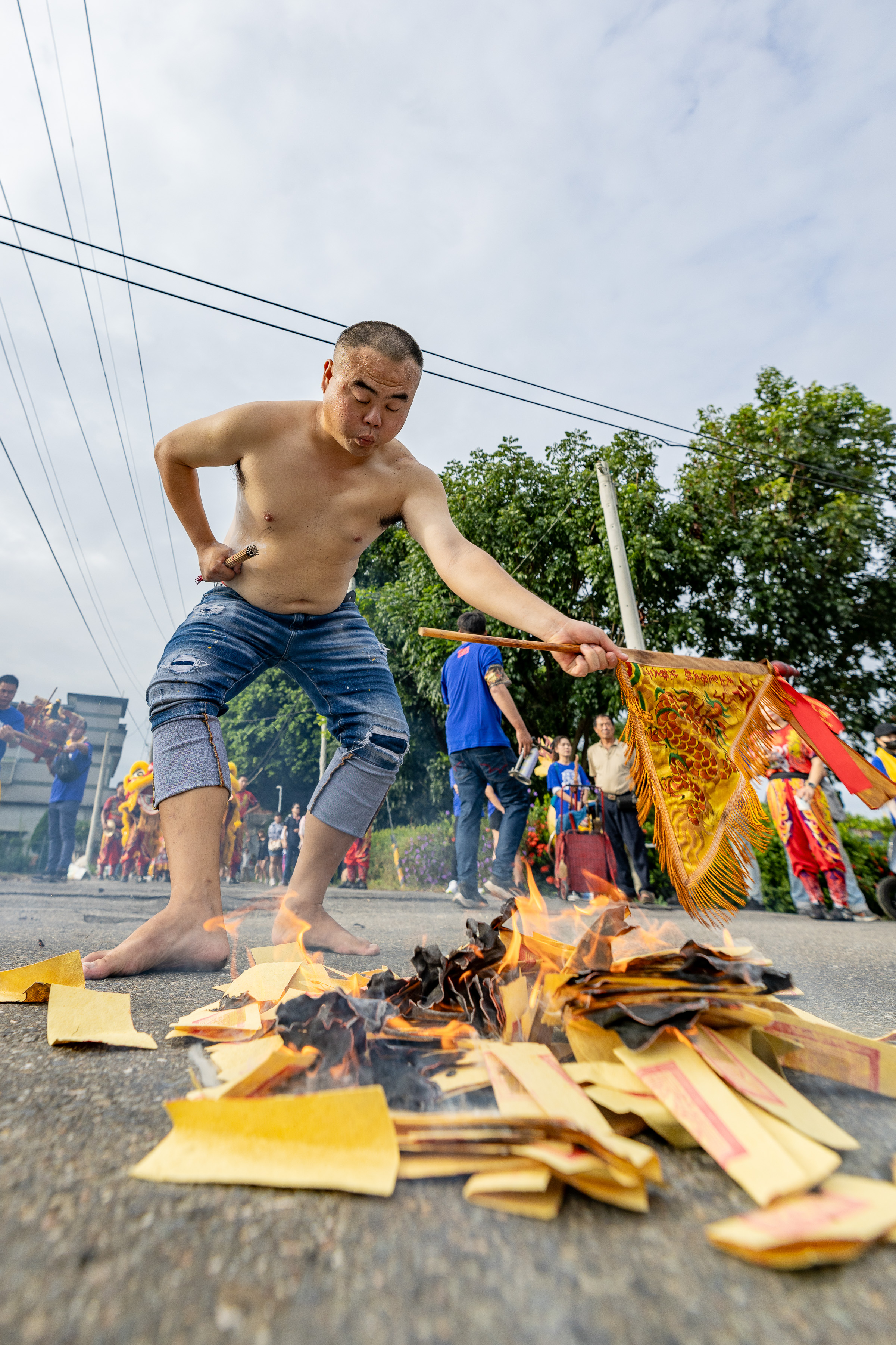 This documentary photo series captures a Taiwanese folk ritual of exorcism and protection performed by a spirit medium at an accident-prone intersection. The photos depict talisman-waving, salt-scattering, joss paper burning, and placement of Five Camps flags. These frames convey both solemnity and spiritual tension, documenting a ritual that blends tradition, community, and cultural resilience.