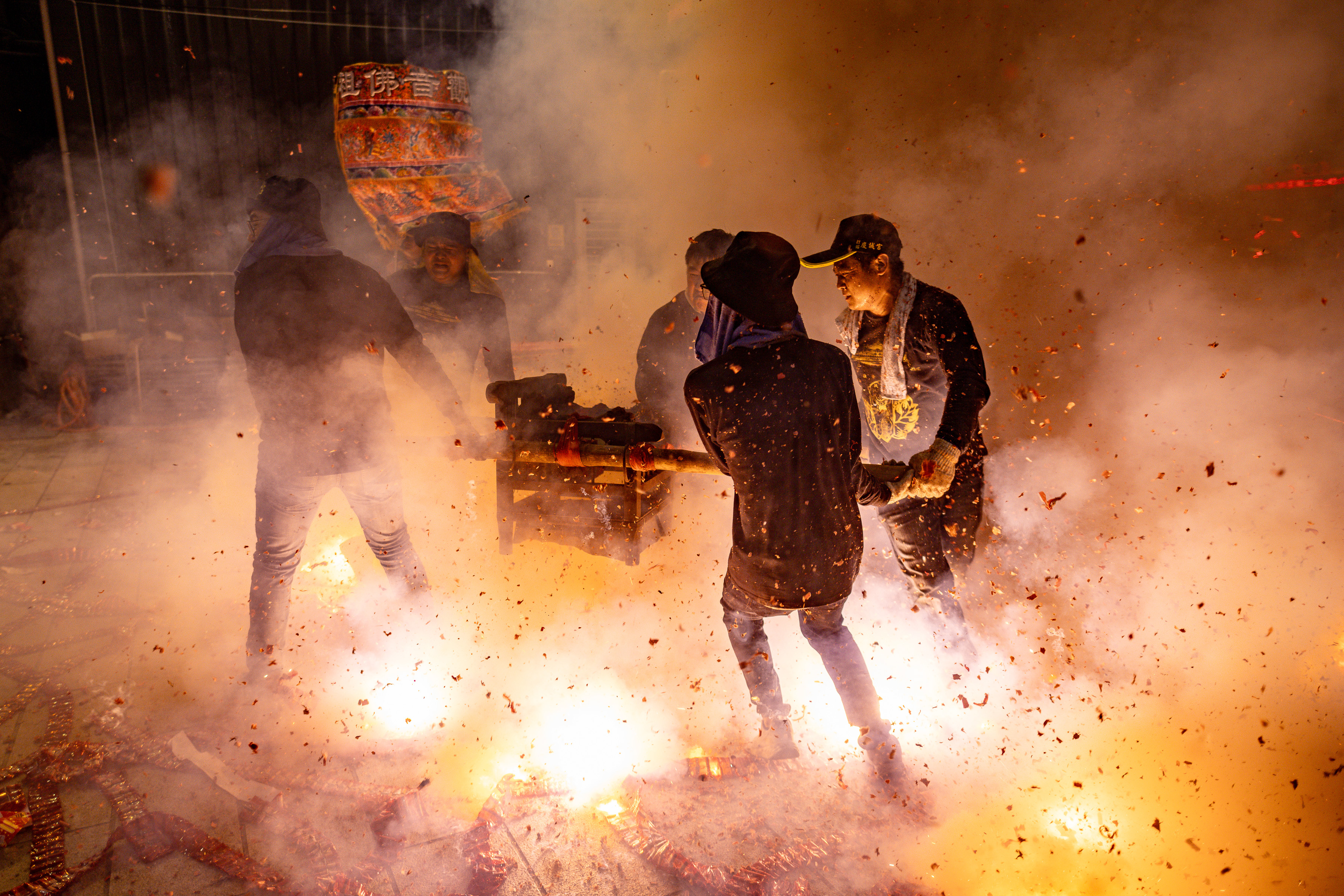 This photo series documents the vibrant pilgrimage of Mazu, Taiwan’s revered sea goddess. Scenes include devotees crawling under her palanquin for blessings, colorful smoke at departure, solemn prayers during passage, and processional footwork through exploding firecrackers—a practice known locally as “eating the fire.” When Mazu’s palanquin pauses at temples, worshippers gather in reverence. These images capture not only ritual intensity but also the spiritual devotion and collective memory that define this faith tradition.