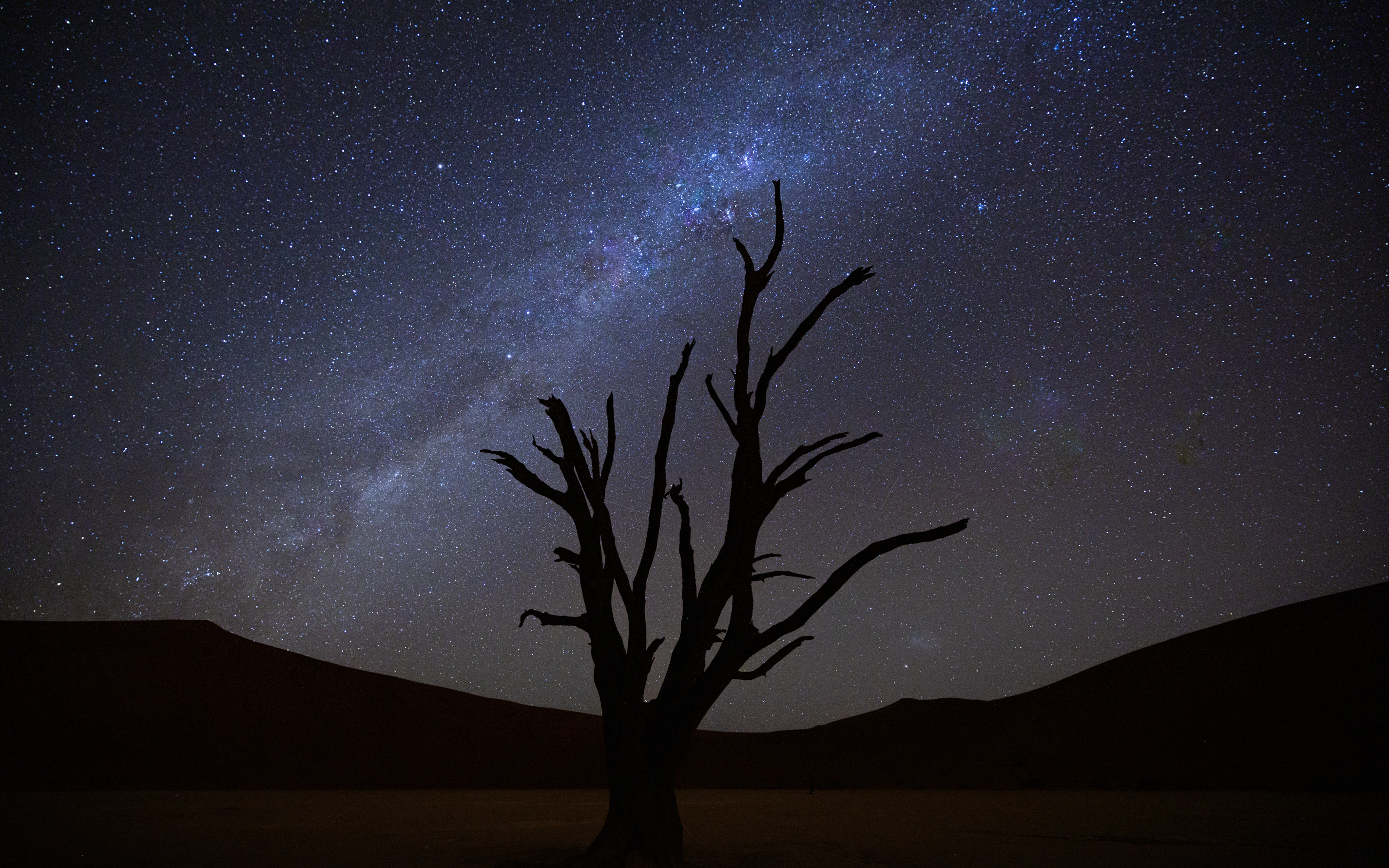 A silhouetted tree stands against a breathtaking night sky filled with countless stars and the Milky Way. The landscape is enveloped in darkness, emphasizing the grandeur of the celestial display above. Deadvlei Namibia.