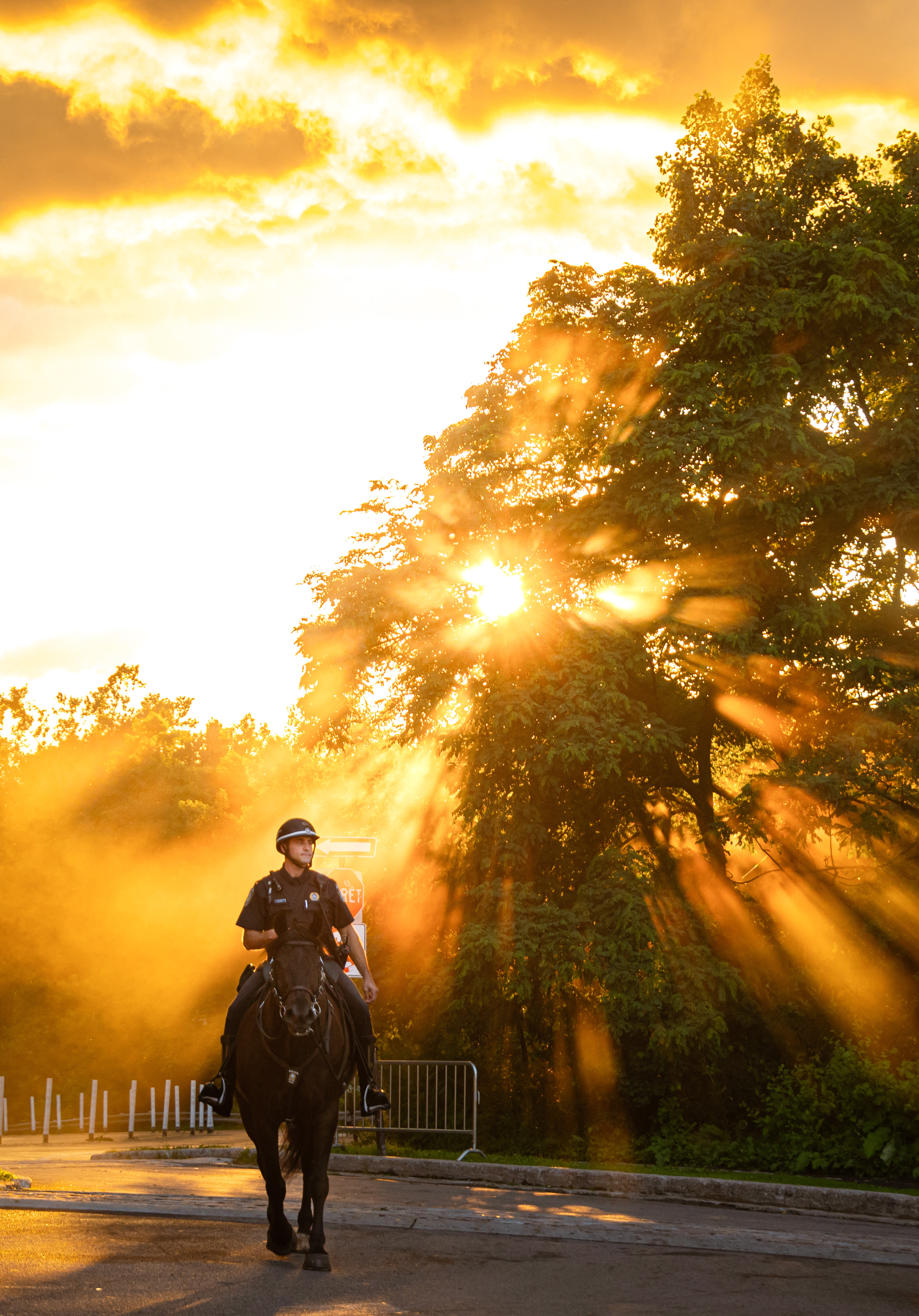 This photograph captures a rare moment in Montreal, following an intense storm. During the storm, police officers were seen helping stranded drivers. As the storm subsided and the sky cleared, I was photographing the beautiful sight of Tyndall light filtering through the leaves. In that moment, a police officer on horseback unexpectedly appeared in the frame, resembling a triumphant warrior. No matter the circumstances, they stand firm, protecting the city.
