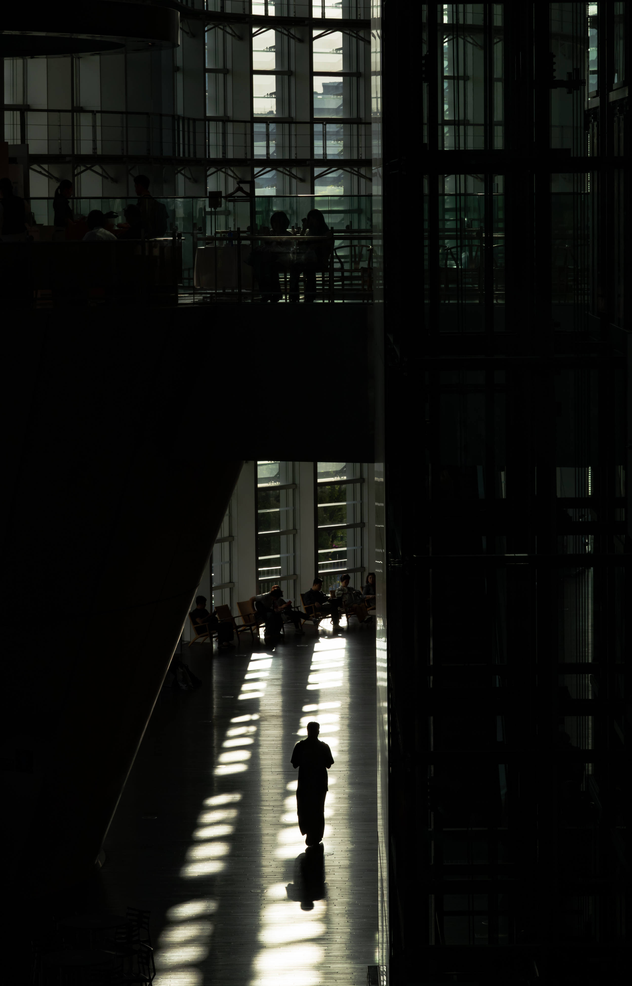 A figure walks the corridor, alone. The path before him is made of light. The space around him is made of silence.