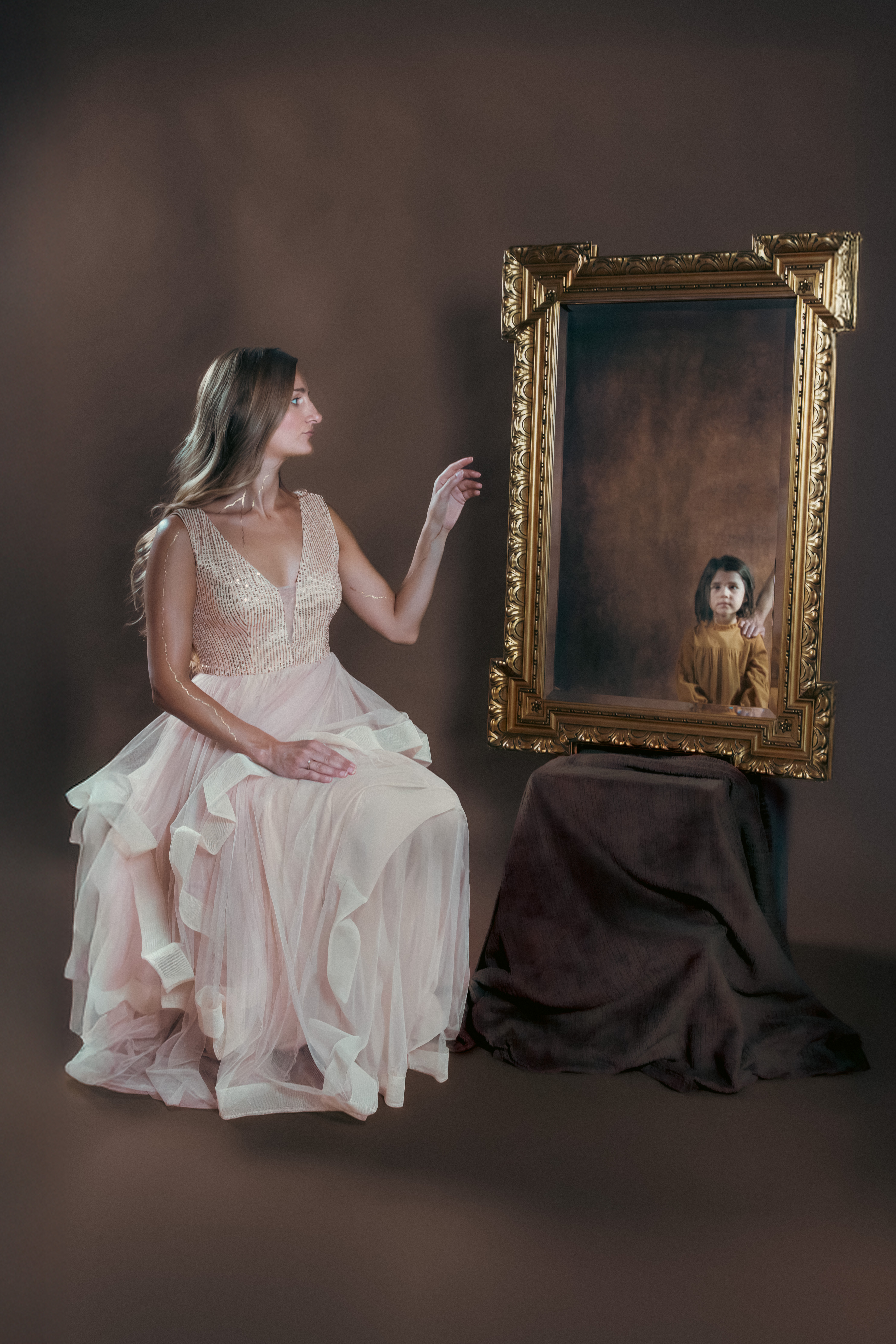 The Lines That Shaped Me The wounds of her years became scars, invisible yet deep—lines that shaped who she would become. In the photograph, she sits in a gown that shimmers with light, symbolizing the strength and dignity she reclaimed. The golden fabric echoes the golden scars she carries within—proof that healing can transform pain into beauty. Before her stands a mirror. Inside, the reflection is not her present self, but the little girl she once was—innocent, fragile, still holding the weight of those early years. A hand rests gently on the child’s shoulder, a gesture of comfort, telling her that everything is going to be alright. The image bridges past and present: the adult woman acknowledging her inner child, offering solace, and showing that survival can turn into growth. The scars remain, but they no longer define her as broken. Instead, they are the lines that shaped her—lines now filled with gold.