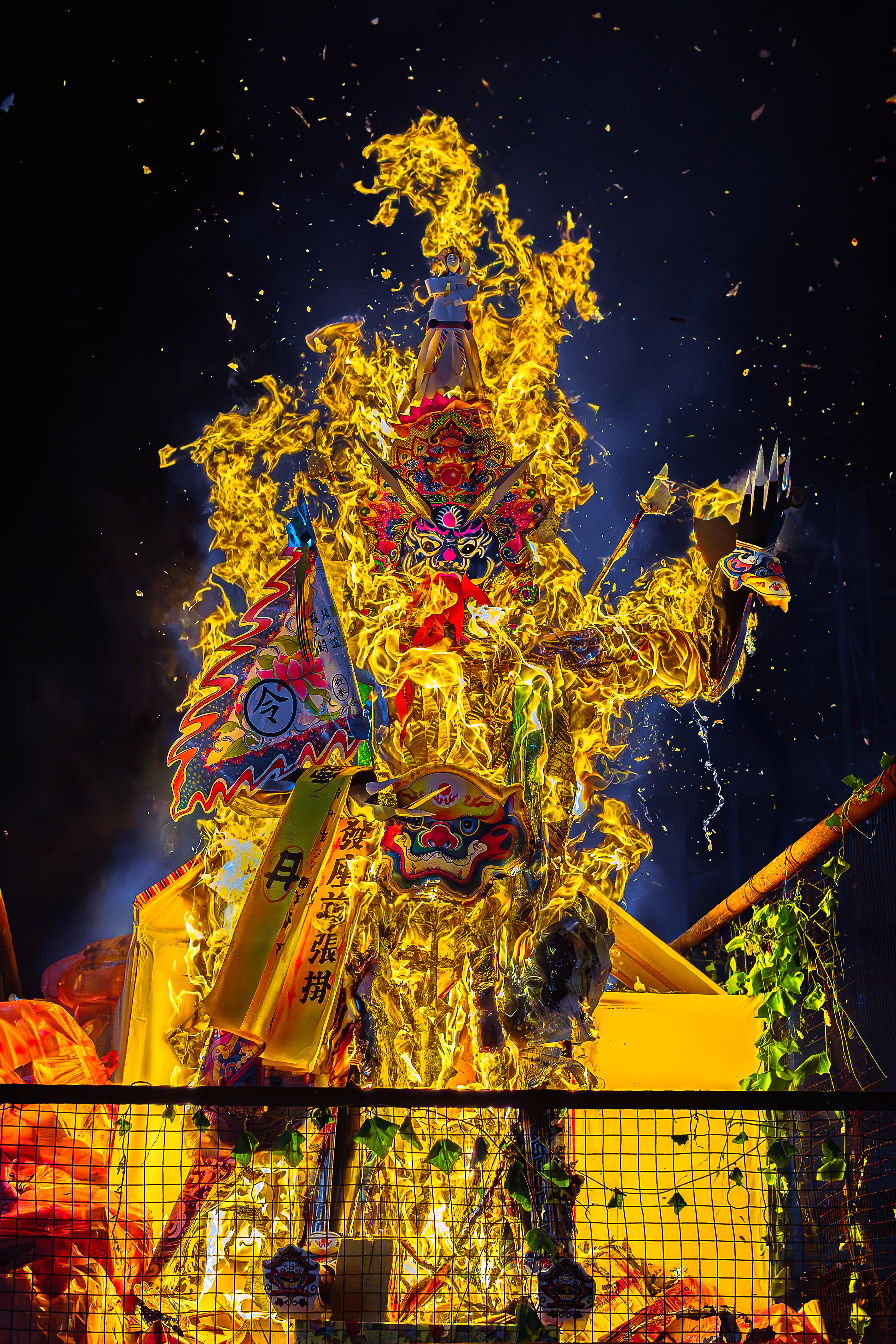 The Huwei Zhongyuan Pudu has its origins in a sombre chapter of local history. During the era of Japanese rule, the area around what is now Huwei's busiest roundabout was a grim execution ground where countless lives were lost. Over time, however, the site was transformed into a bustling marketplace, becoming a hub of daily life for the community. However, the tragic past lingered, with frequent accounts of supernatural encounters causing unease among the residents. In an attempt to appease the spirits of the departed and bring peace of mind to the living, local elders and community leaders proposed holding an annual Zhongyuan Pudu (Ghost Festival) ceremony. Central to this ritual is the towering paper effigy of 'Da Shi Ye'. Revered as the 'King of Ghosts', he presides over the festival, maintaining order among the spirits and ensuring that all souls can peacefully receive the offerings and salvation rites. Born of compassion and reverence, this ritual expanded year by year, growing from within the market to encompass the surrounding streets of Huwei. At its climax, spectacular fireworks rend the night sky, serving as a sublime offering to the deities and a guiding light for the wandering souls. The festival has evolved into a vital tradition that unites the community, transforming a history of tragedy into an annual celebration of remembrance, respect, and prayer for peace.
