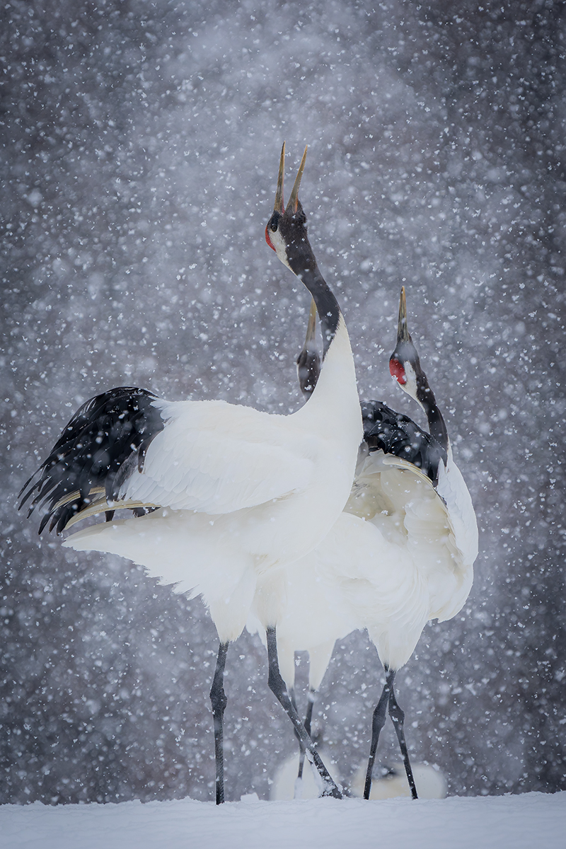A japanese crane cries heavenward in the heavy snow.It is as if they are singing a song of life.A hymn to life.Its voice is like a hymn to God.