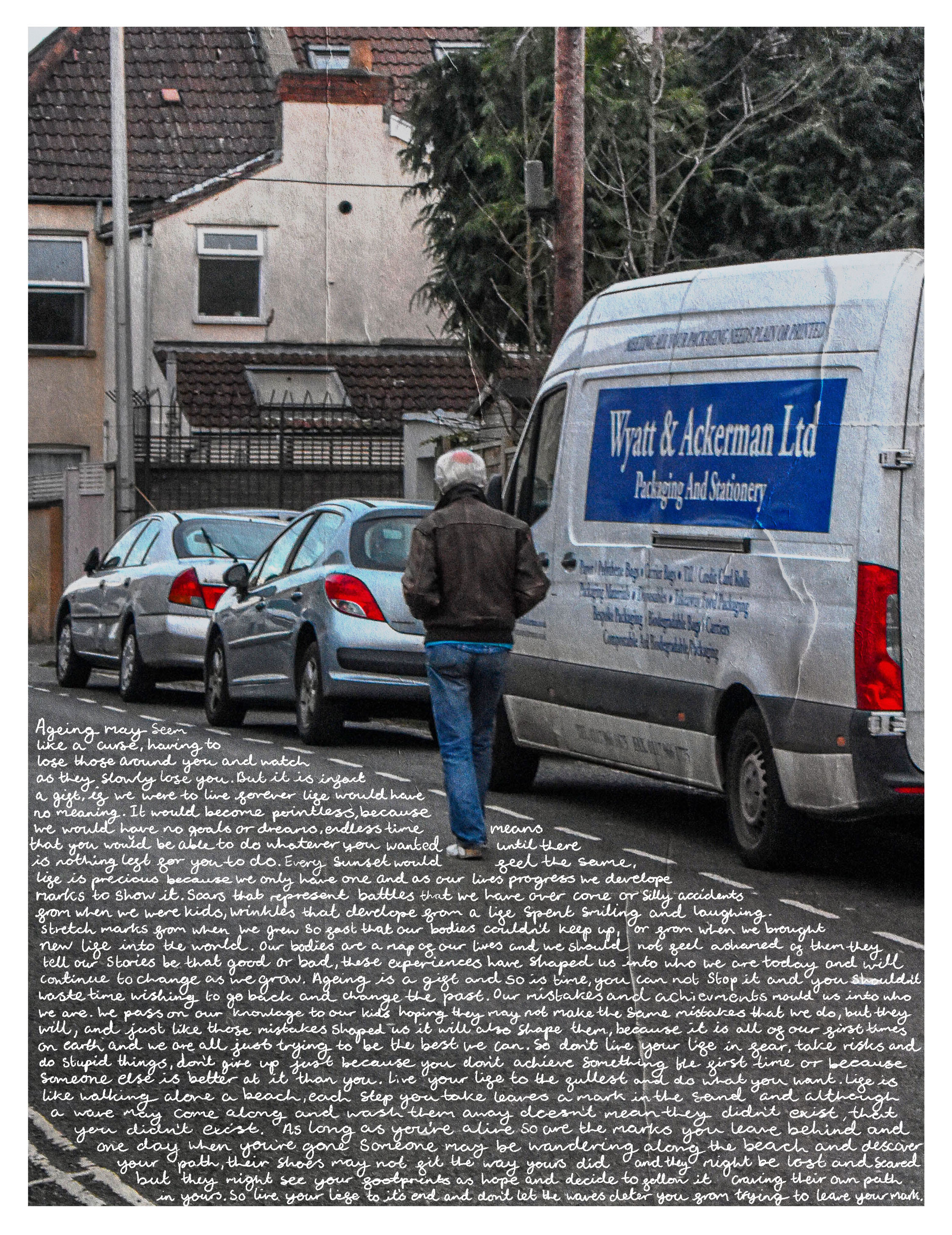Inspired by artists such as Duane Michals, I chose to go out onto the street and photograph people passing by. I then handwrote pieces that spoke about important parts of the human experience onto the images. When writing, I choose to leave spelling mistakes and punctuation mistakes visible within the piece, as I believe that it makes it more human.