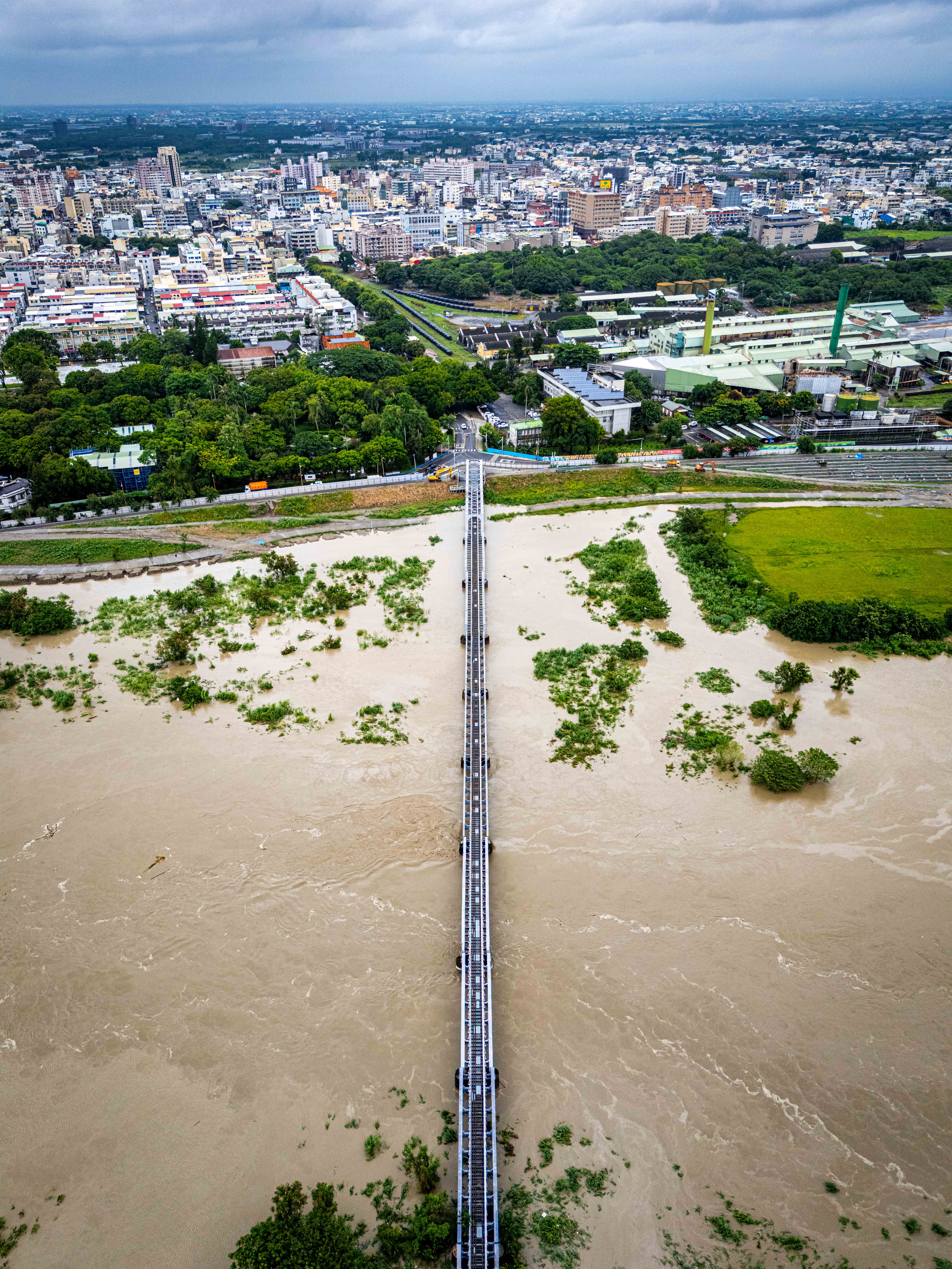 From above, the raging river swallows its banks, surging dangerously close to the city’s heart. The bridge, a fragile lifeline of steel, stretches across the muddy torrent, standing as a symbol of resilience between nature’s fury and human civilization. This aerial perspective reveals the raw dialogue between flood and survival, chaos and order — a reminder of our fragile balance within the forces of nature.