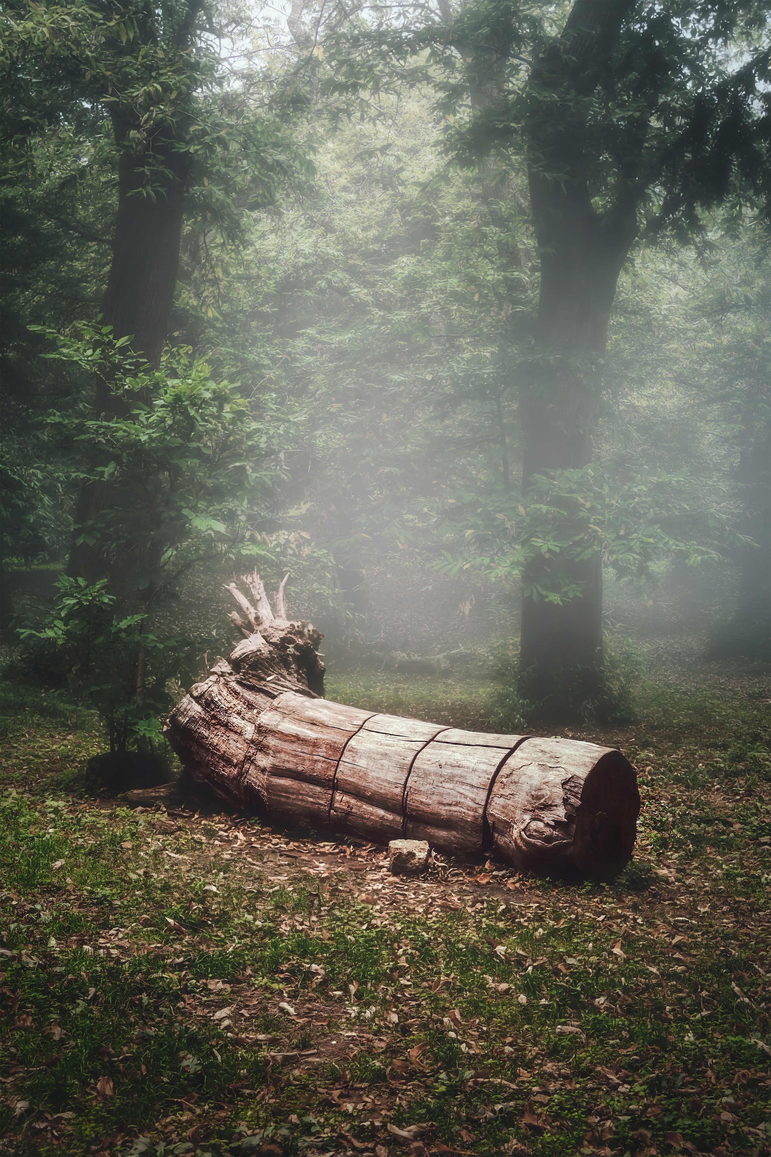 A large weathered tree stump lies on the forest floor within fog.