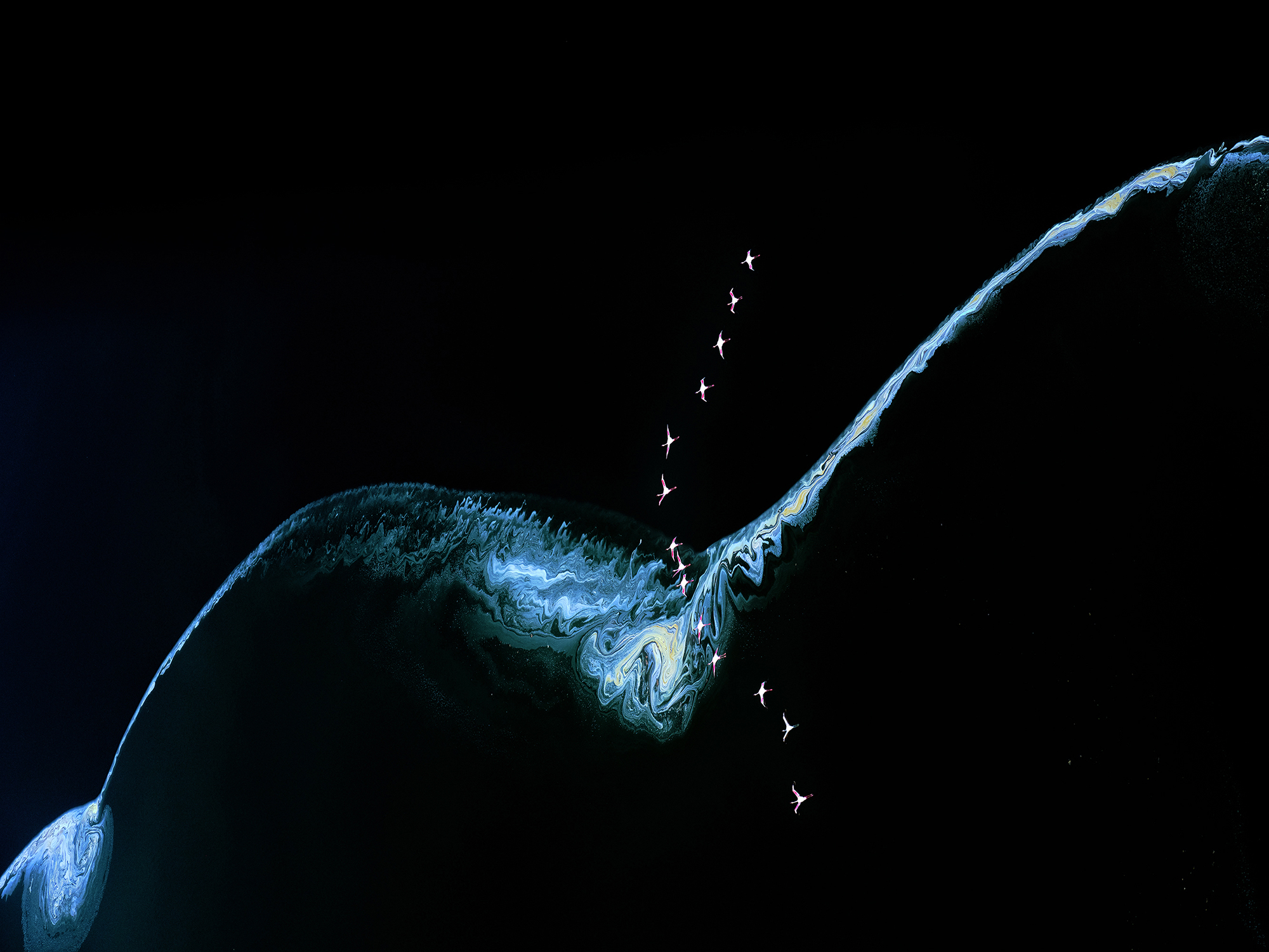 Pink flamingoes flying over Lake Magadi in Kenya. Shot from Helicopter