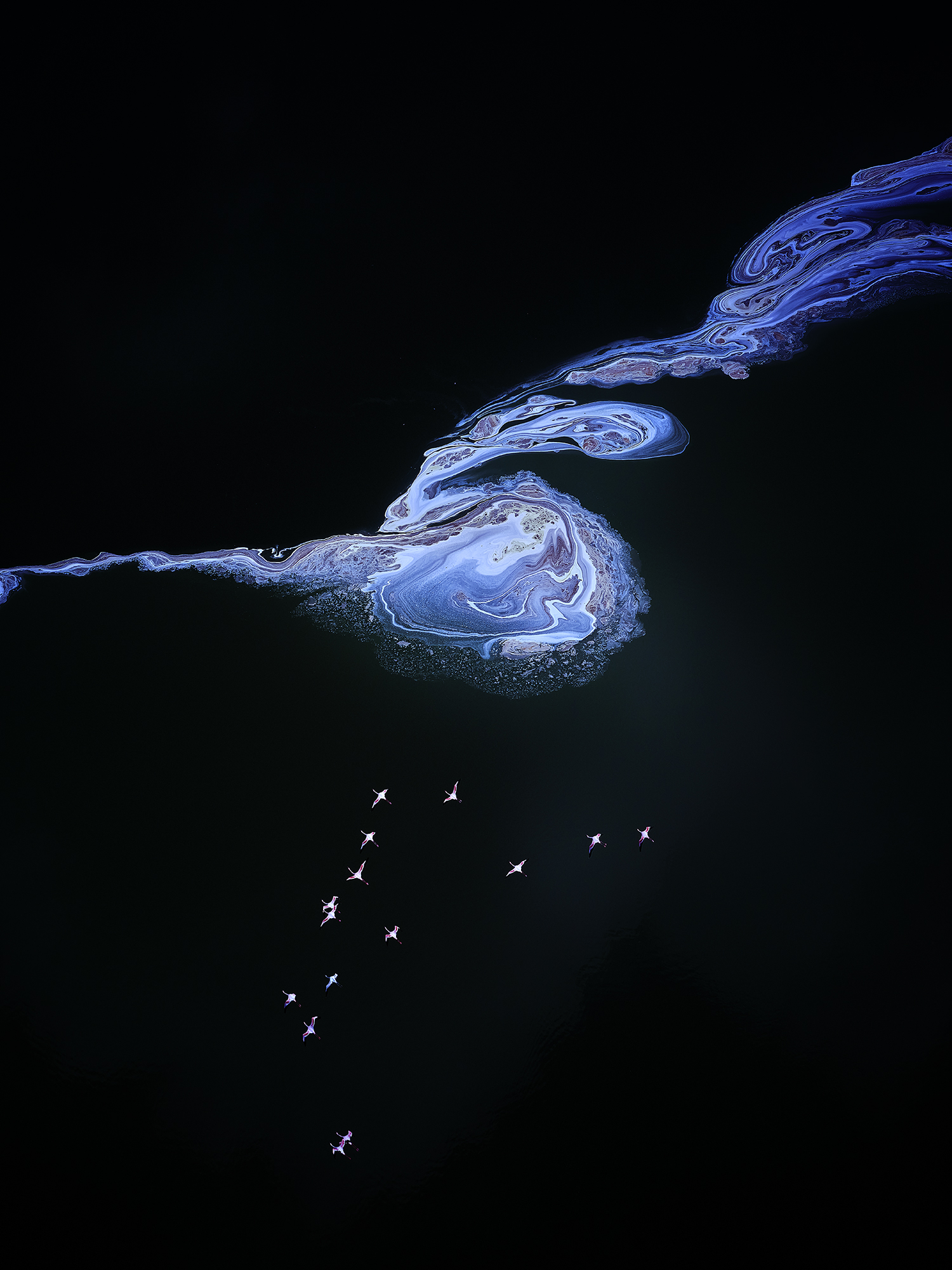 Pink flamingoes flying over lake Magadi in Kenya shot from helicopter