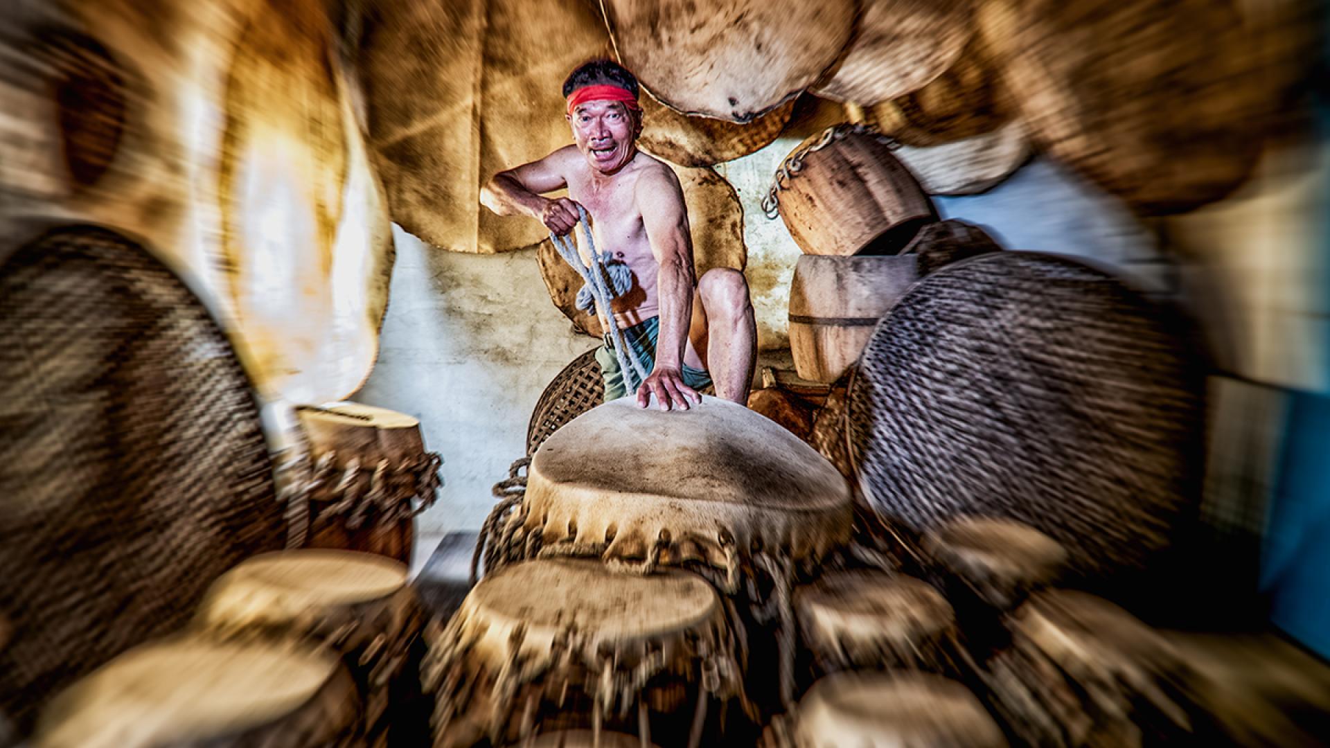 Making drums by hand is a traditional cultural activity.